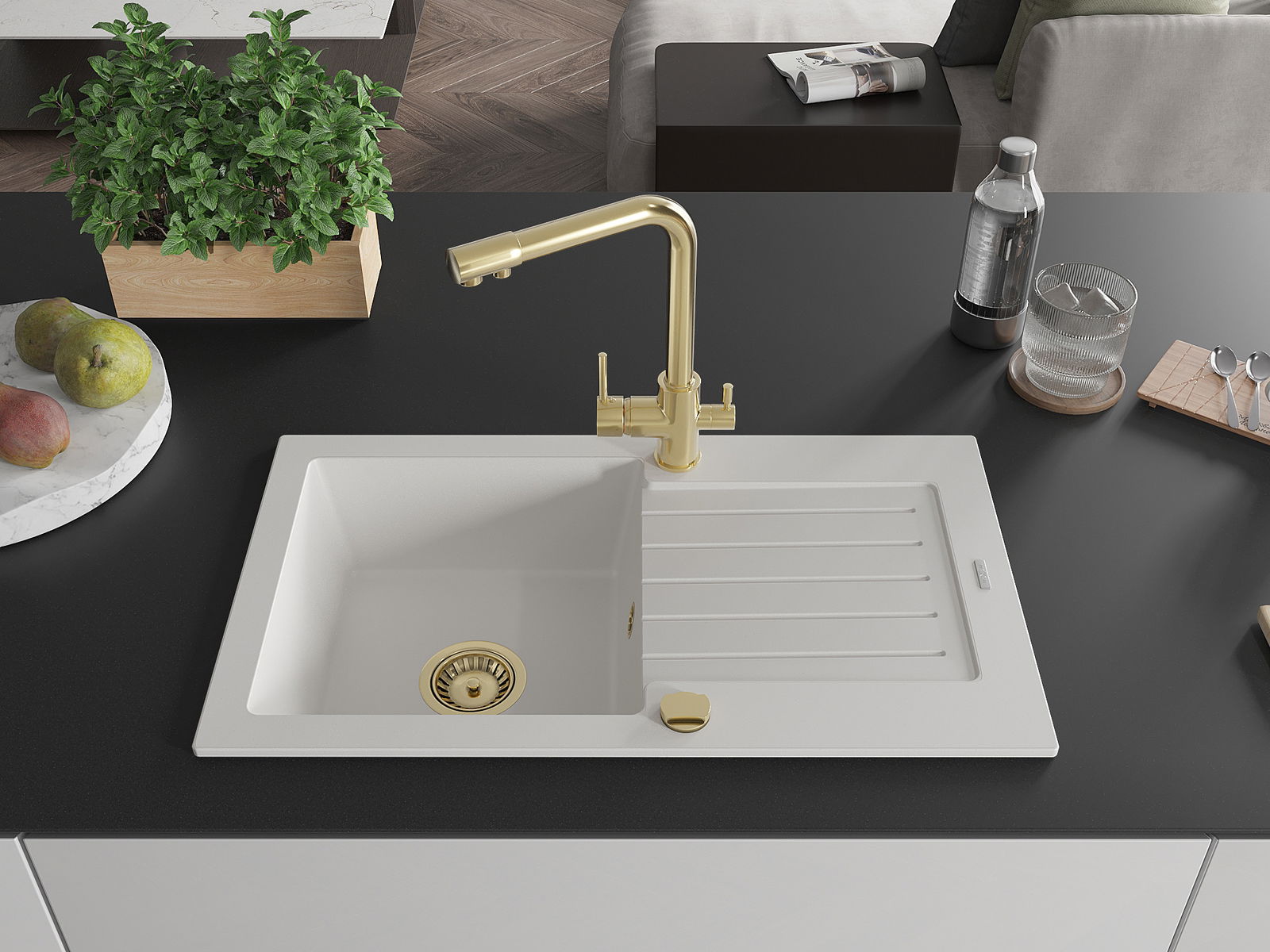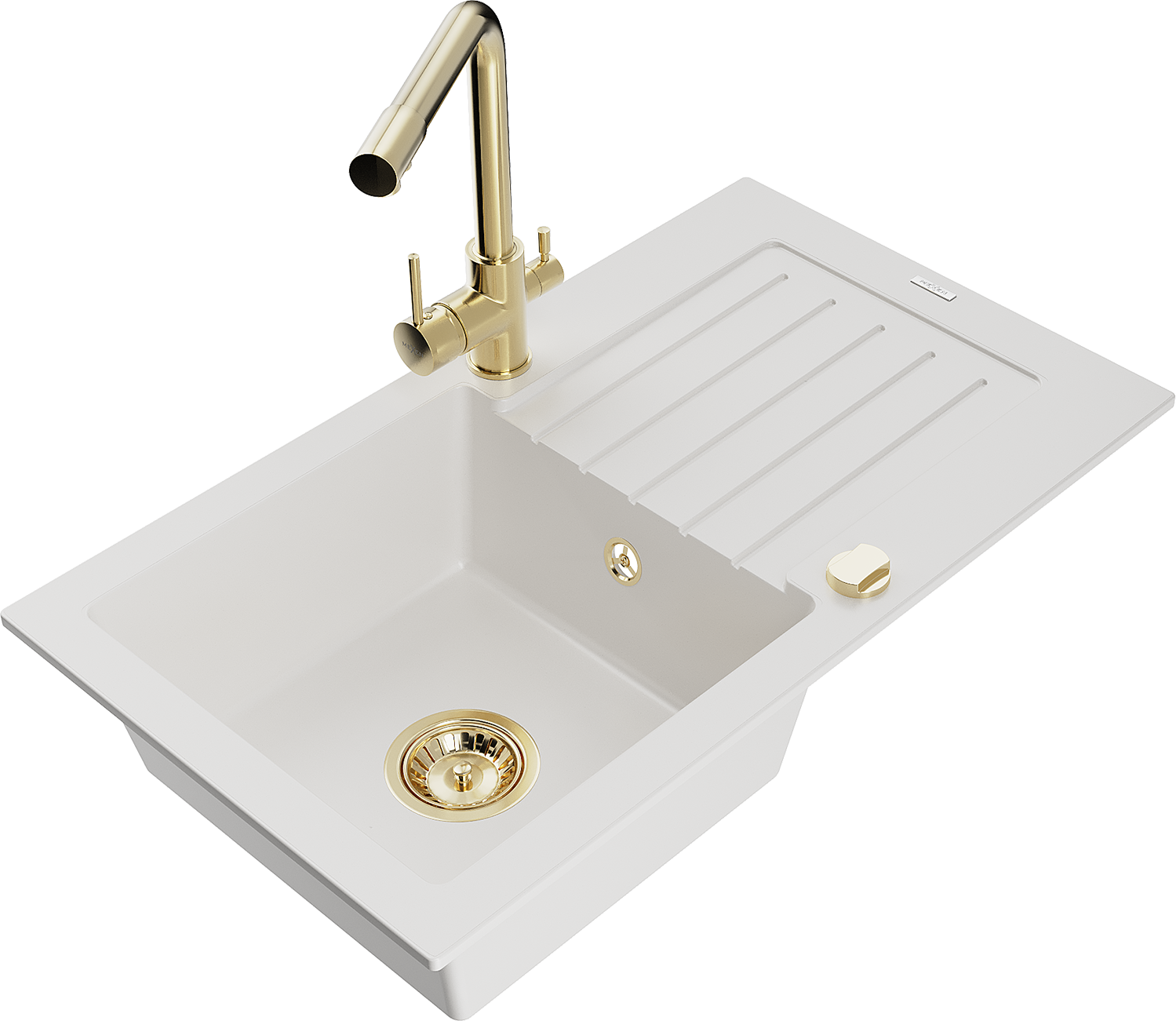 Mexen Pablo granito plautuvė 1 skyrios su nutekėjimo lėkšte ir virtuvės čiaupu Duero, baltas - 6510-20-671600-50