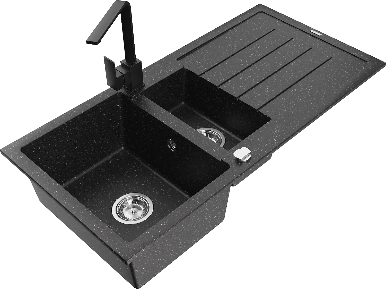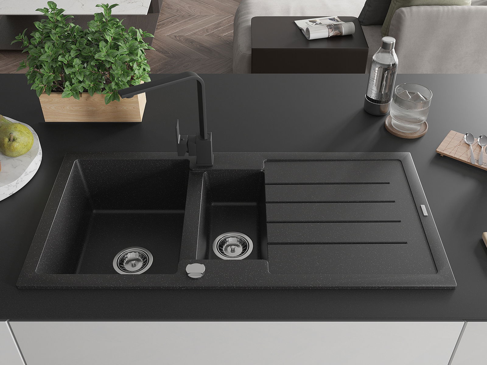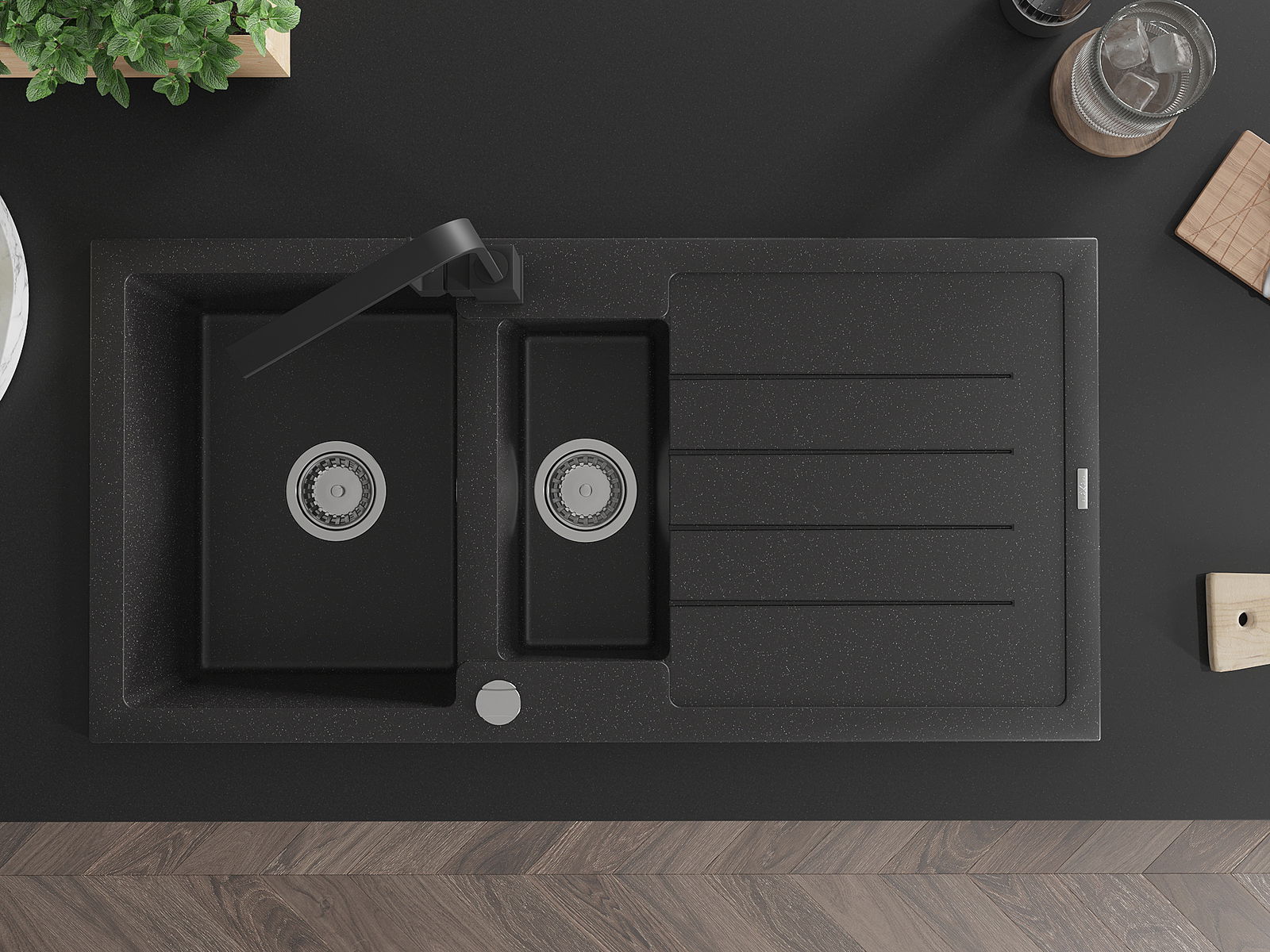 Mexen Andres granitinė 1,5 kamerų plautuvė su nutekėjimu ir virtuviniu maišytuvu Rita, juoda/sidabrinė metaliko spalva