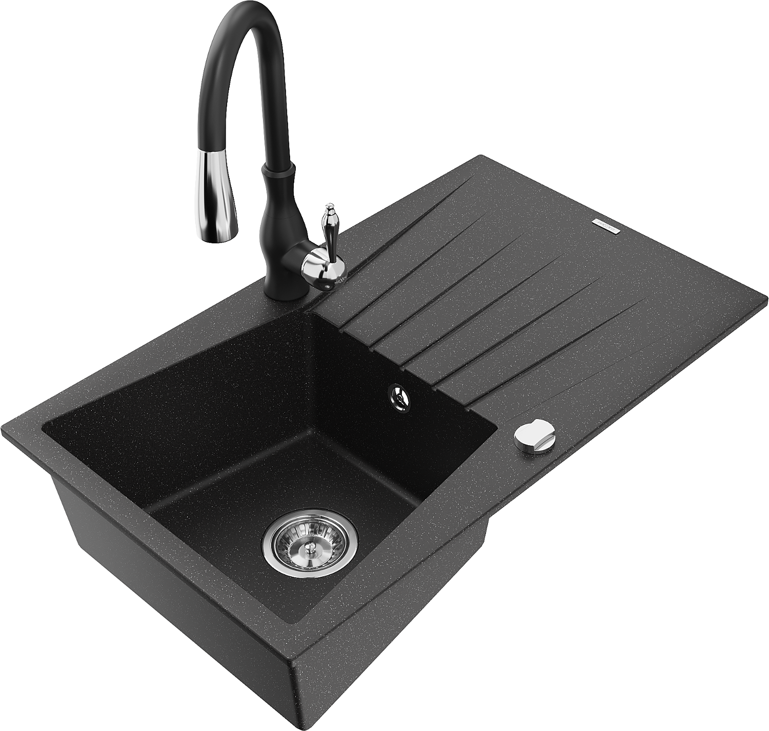 Mexen Cesar granito kriauklė su 1 kamera, su nusausinimo lentyna ir virtuviniu maišytuvu Savita, juoda/sidabrinė metalo spalva ?