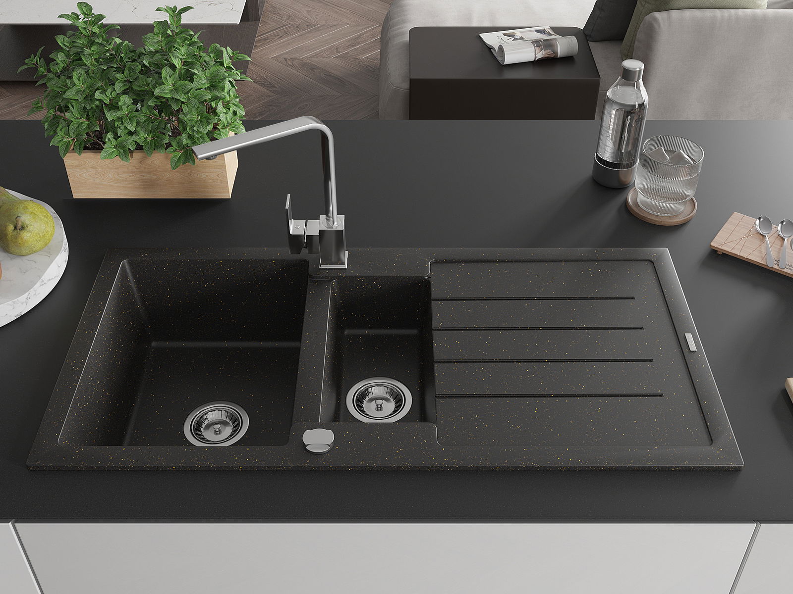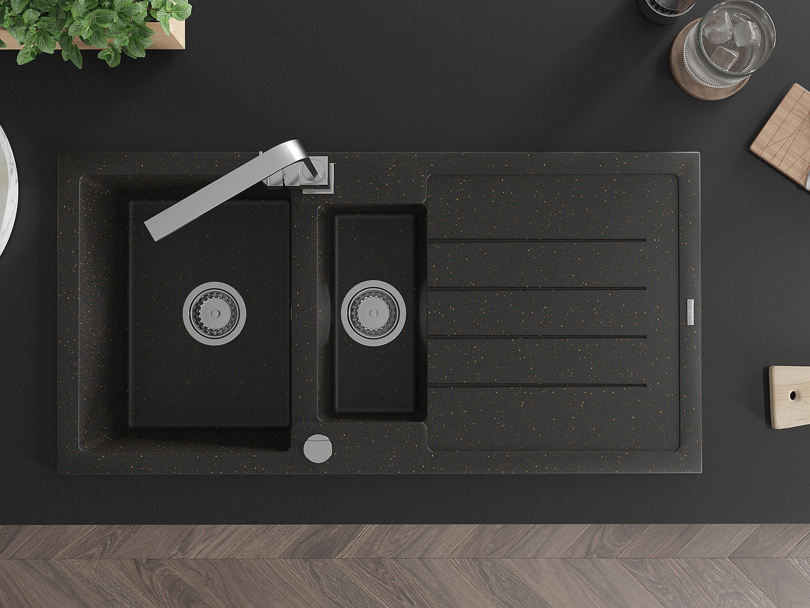Mexen Andres granito kriauklė 1,5 kamerų su nuvarvėju ir virtuviniu maišytuvu Rita, juoda/auksinė metalik - 6515-75-670300-00