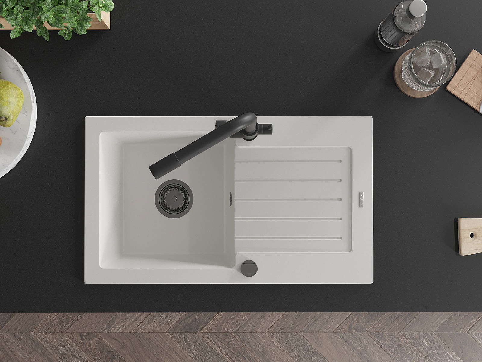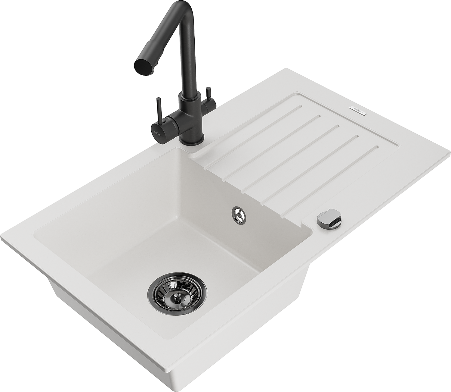 Mexen Pablo granitinis vienos kameros plautuvas su varveklu ir Duero virtuviniu maišytuvu, baltas - 6510-20-671600-70