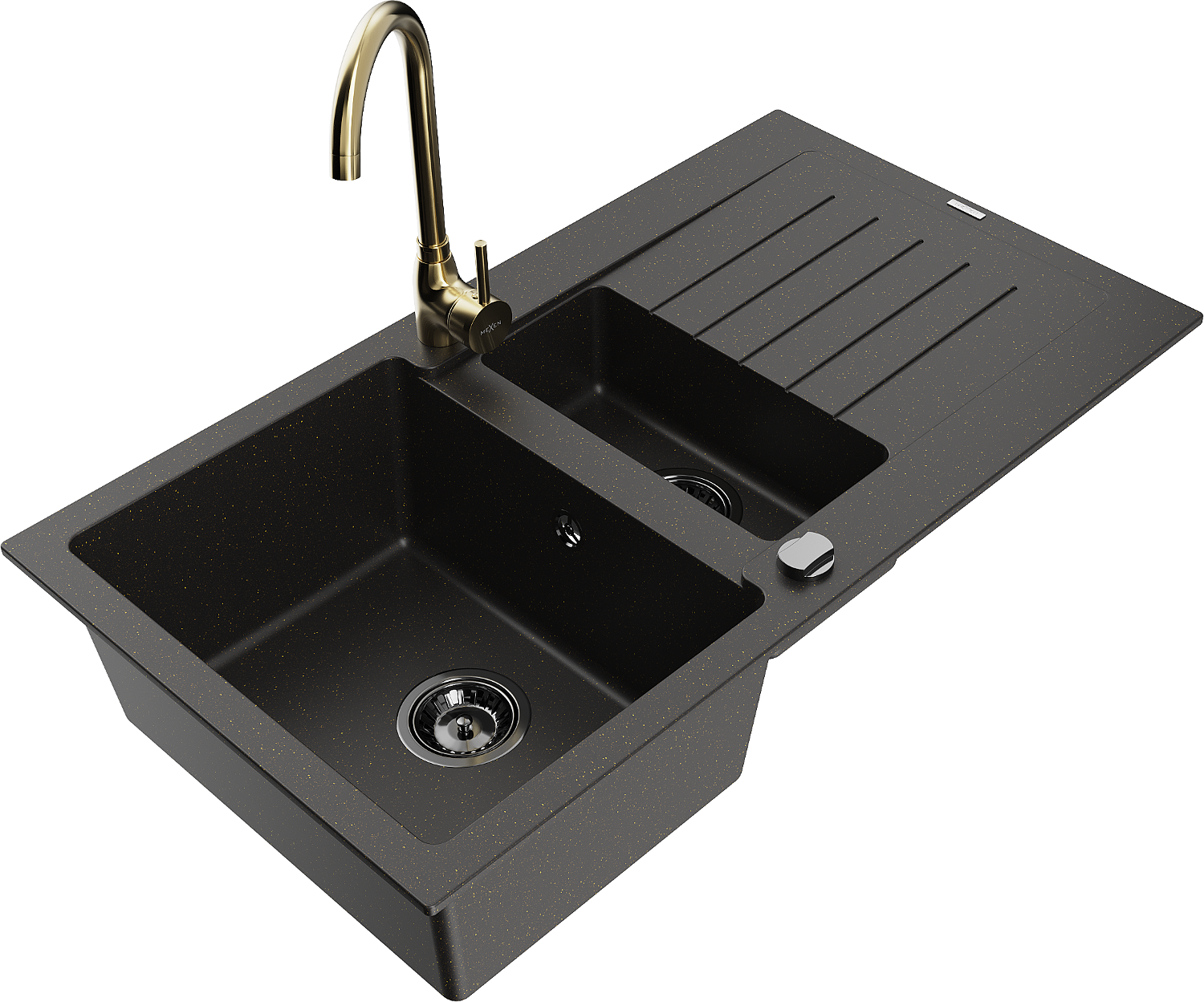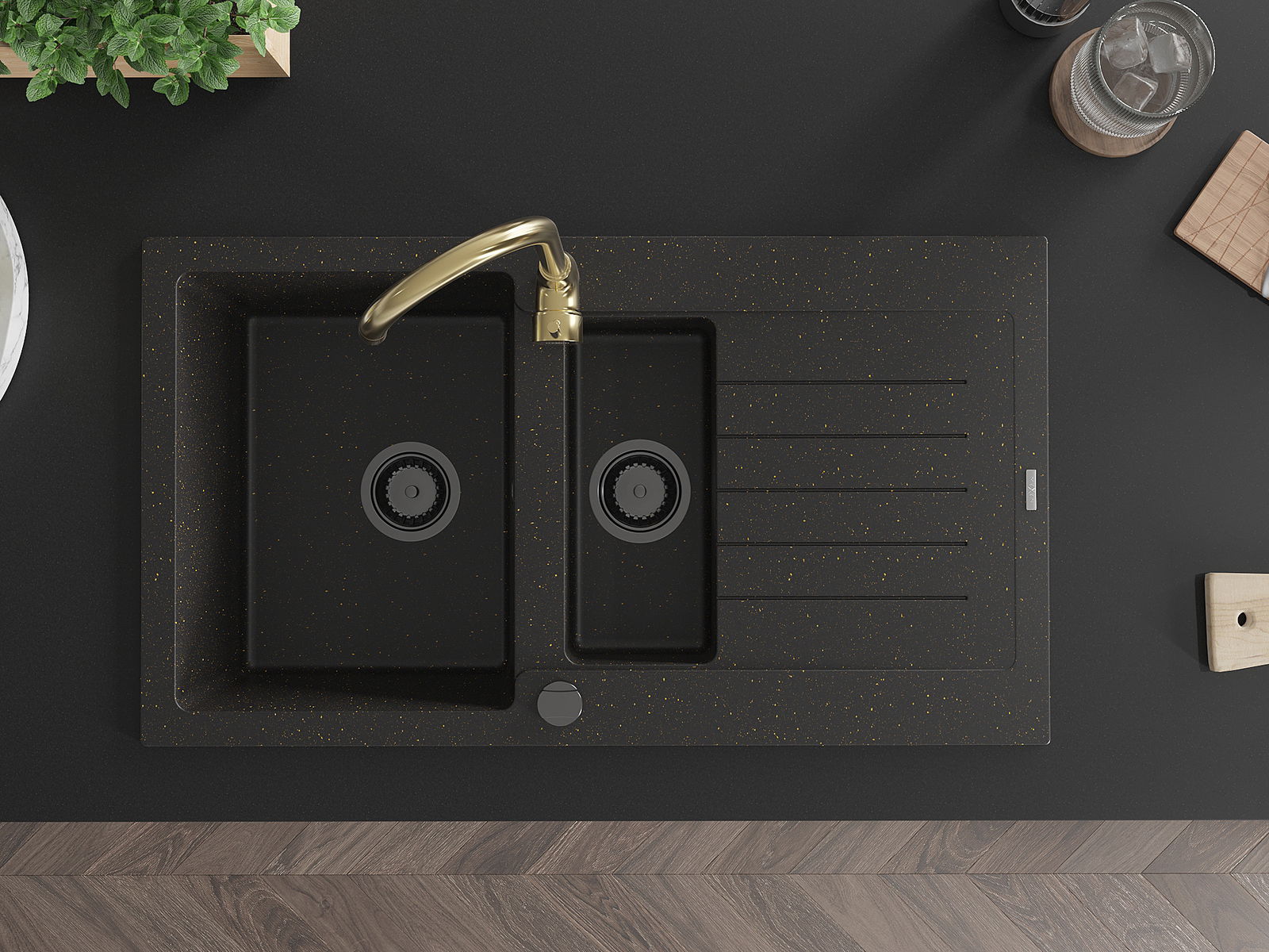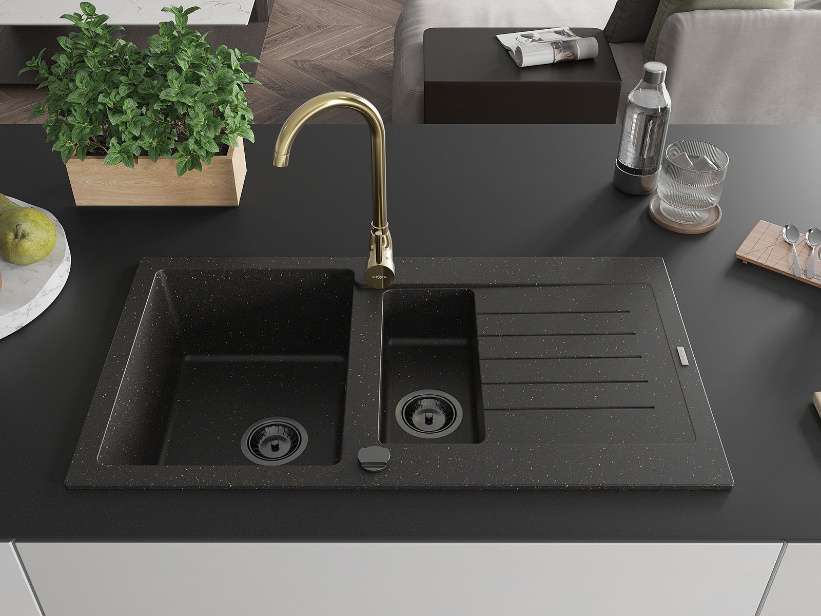 Mexen Matias granitinė plautuvė 1,5 kamerų su nusausintuvu ir virtuviniu maišytuvu Telma, juoda/auksinė - 6502-75-670200-50-B