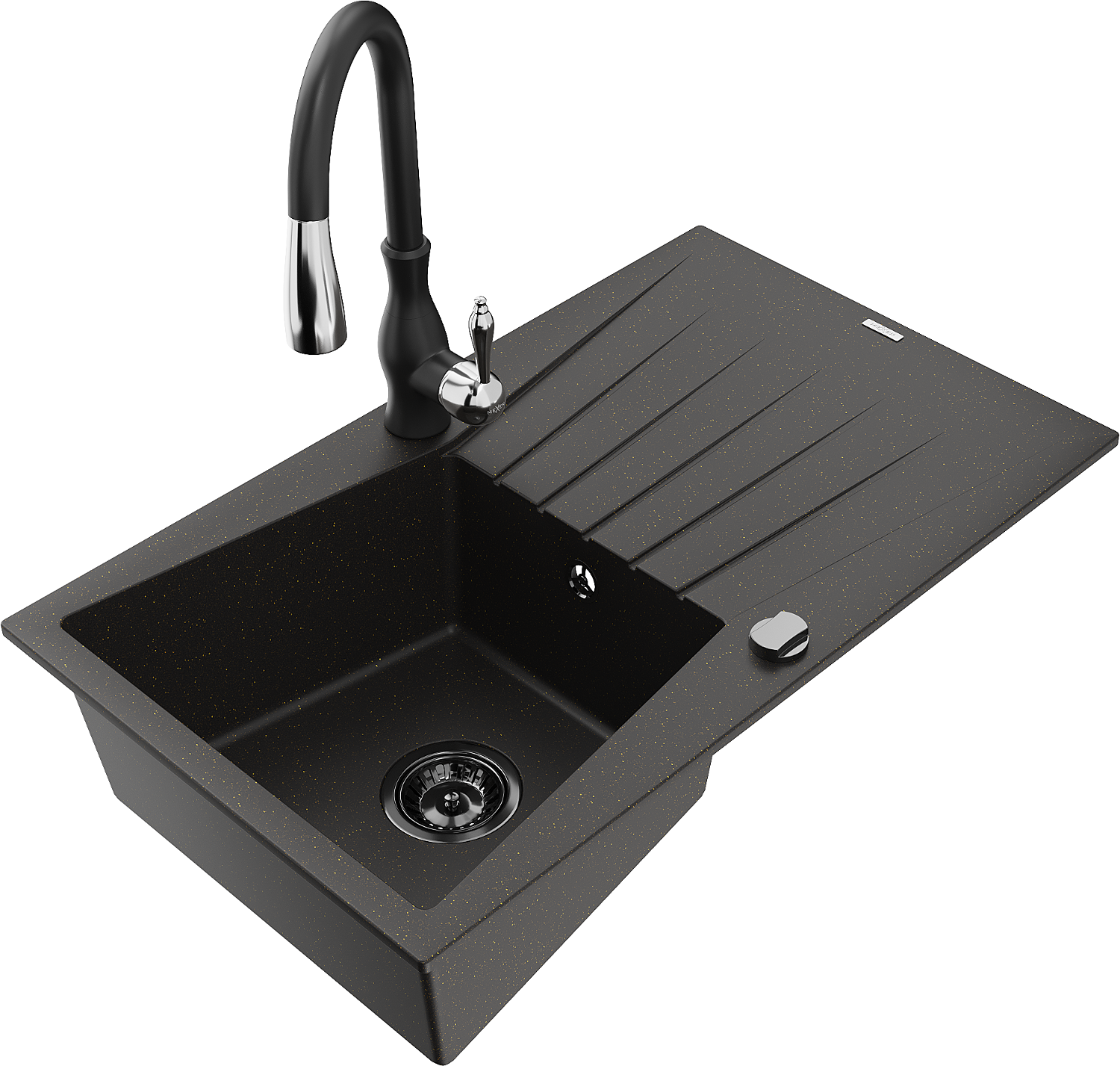 Mexen Cesar vienos dalies granitinė plautuvė su nusausinimo paviršiumi ir virtuviniu maišytuvu Savita, juodas/auksinis metalika?