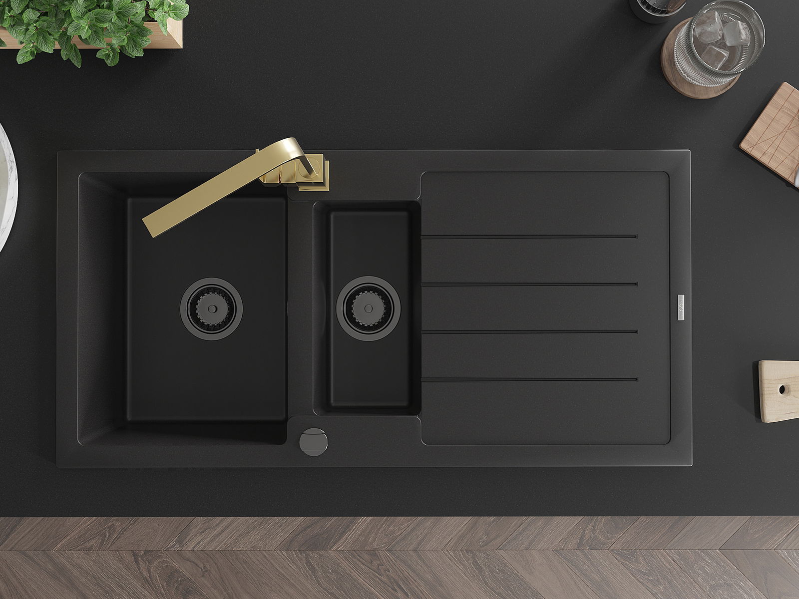Mexen Andres granitinė pusantro dubens kriauklė su nusausintuvu ir virtuviniu maišytuvu Rita, juoda/auksinė metallic