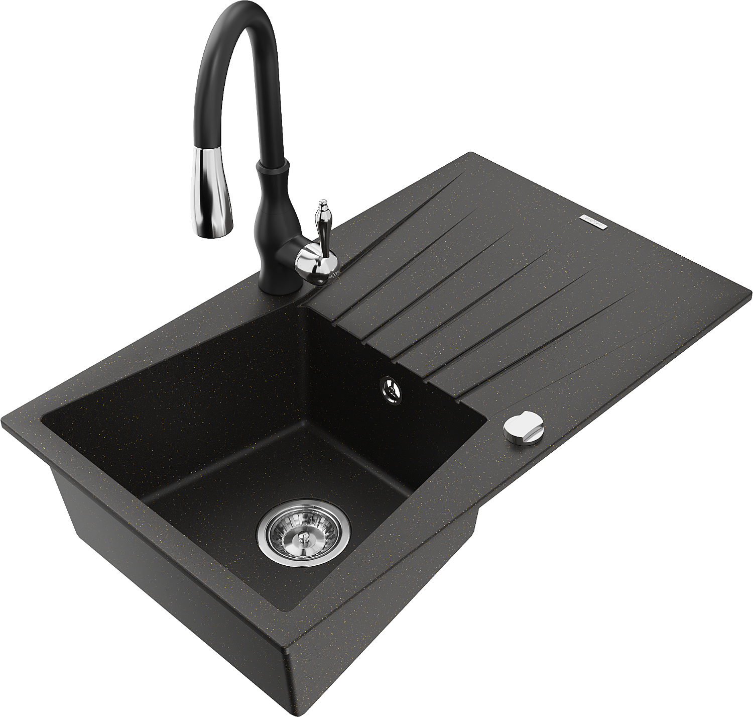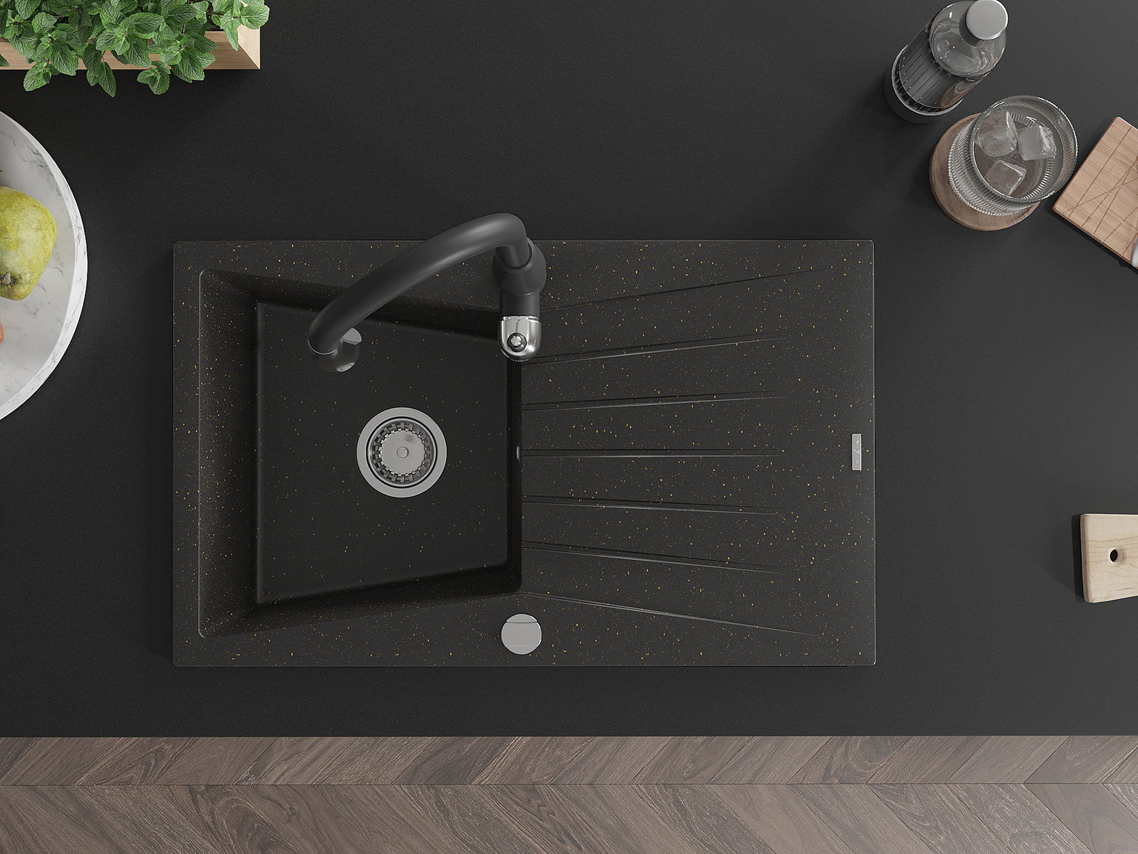 Mexen Cesar granitinė vienos kameros kriauklė su nutekamąja zona ir virtuvine maišytuvu Savita, juoda/auksinė metalikas