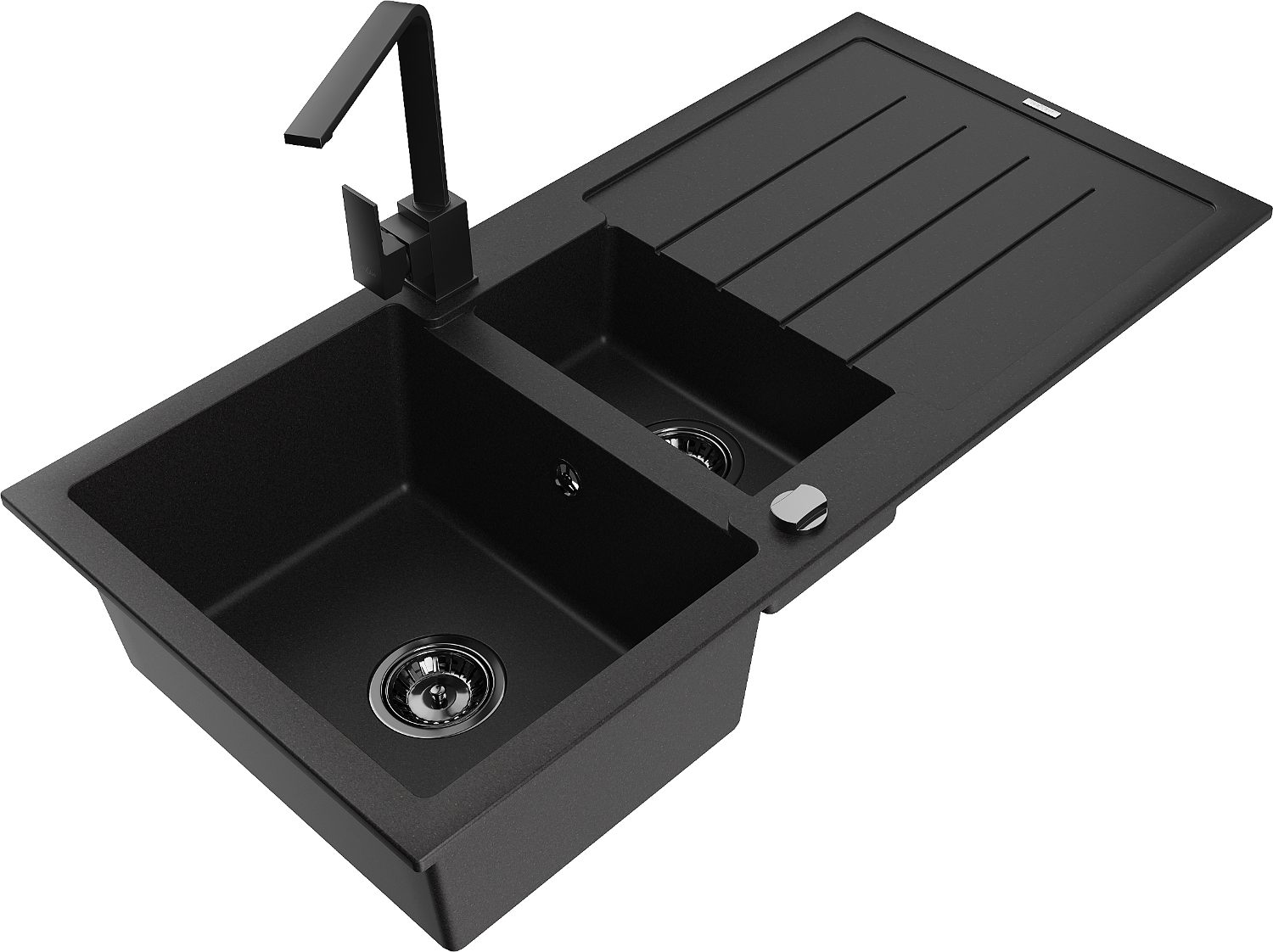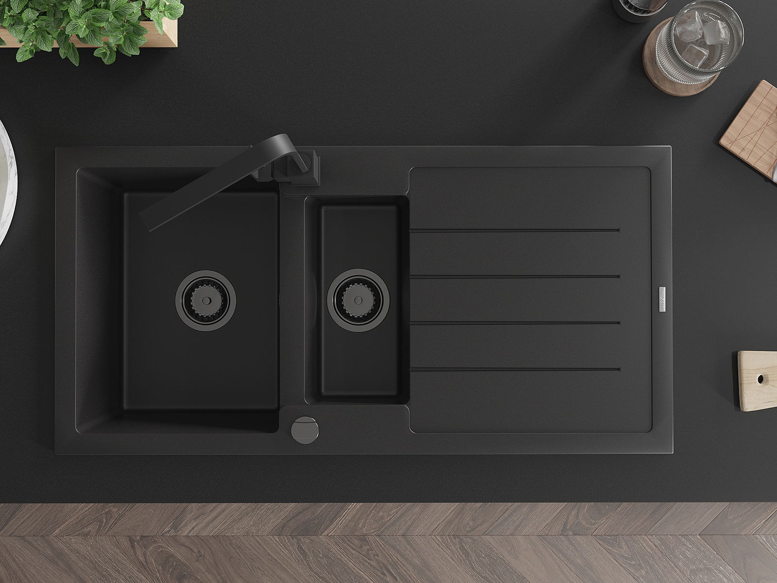 Mexen Andres granitinė kriauklė su 1,5 kameromis, lašintuvu ir virtuviniu maišytuvu Rita, juoda/auksinė metalo spalva