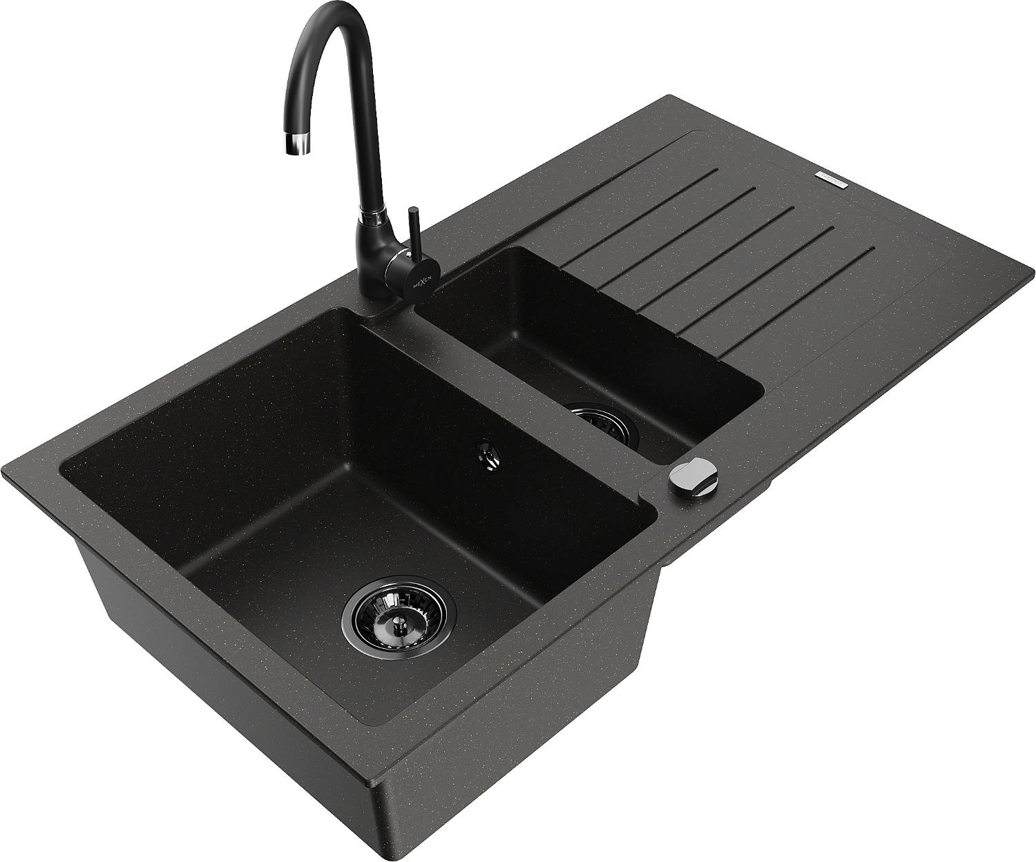 Mexen Matias granitinė 1,5 skyrelio plautuvė su nutekėjimu ir Telma virtuvės maišytuvu, juoda/auksinė - 6502-75-670200-70-B