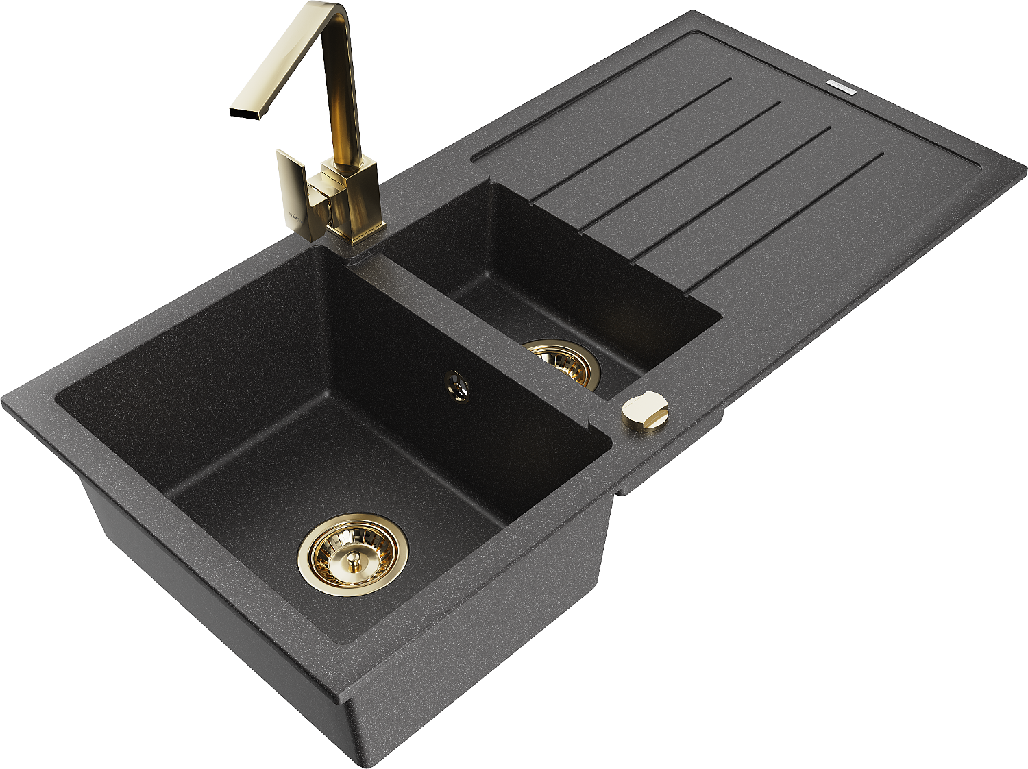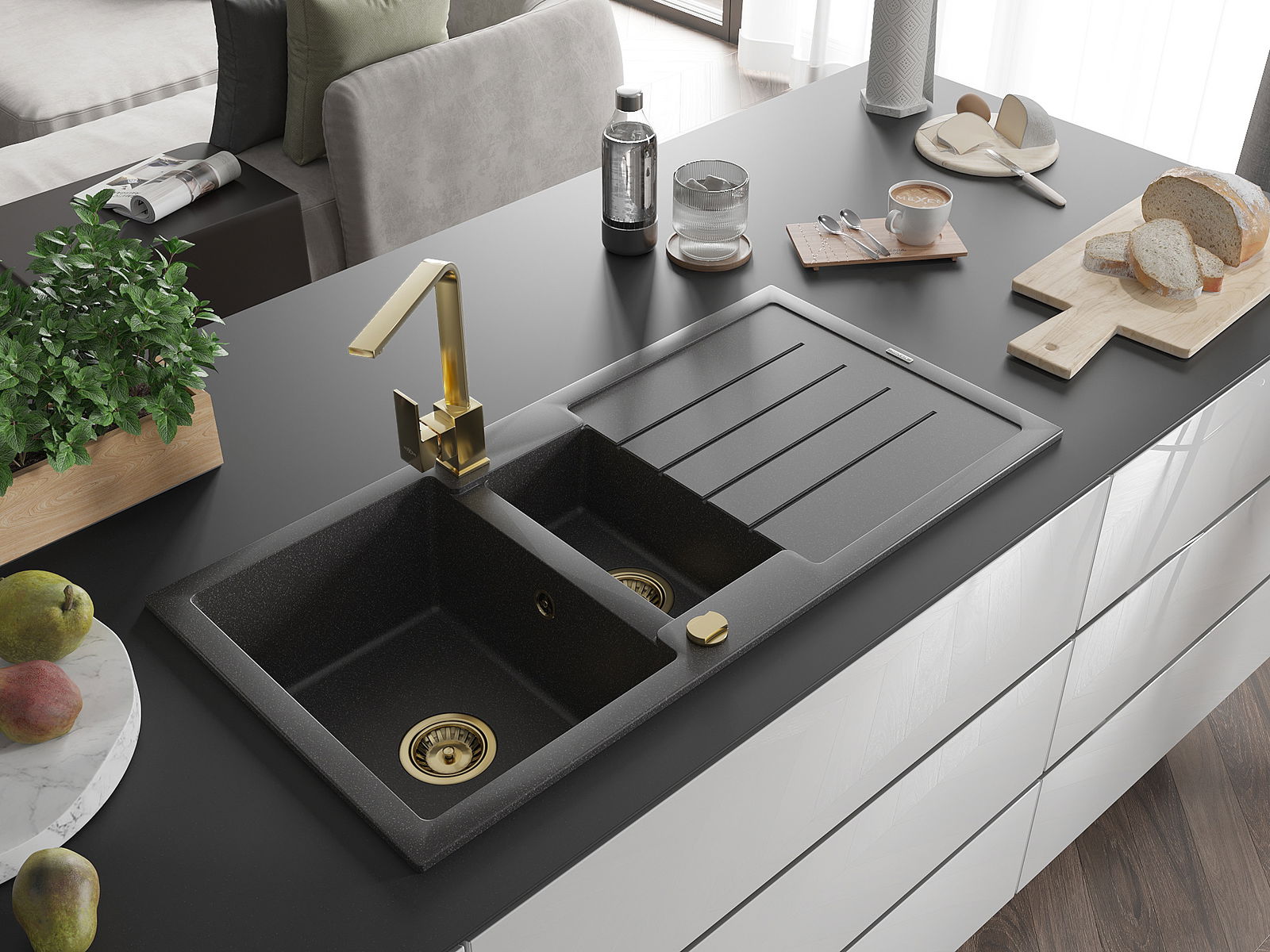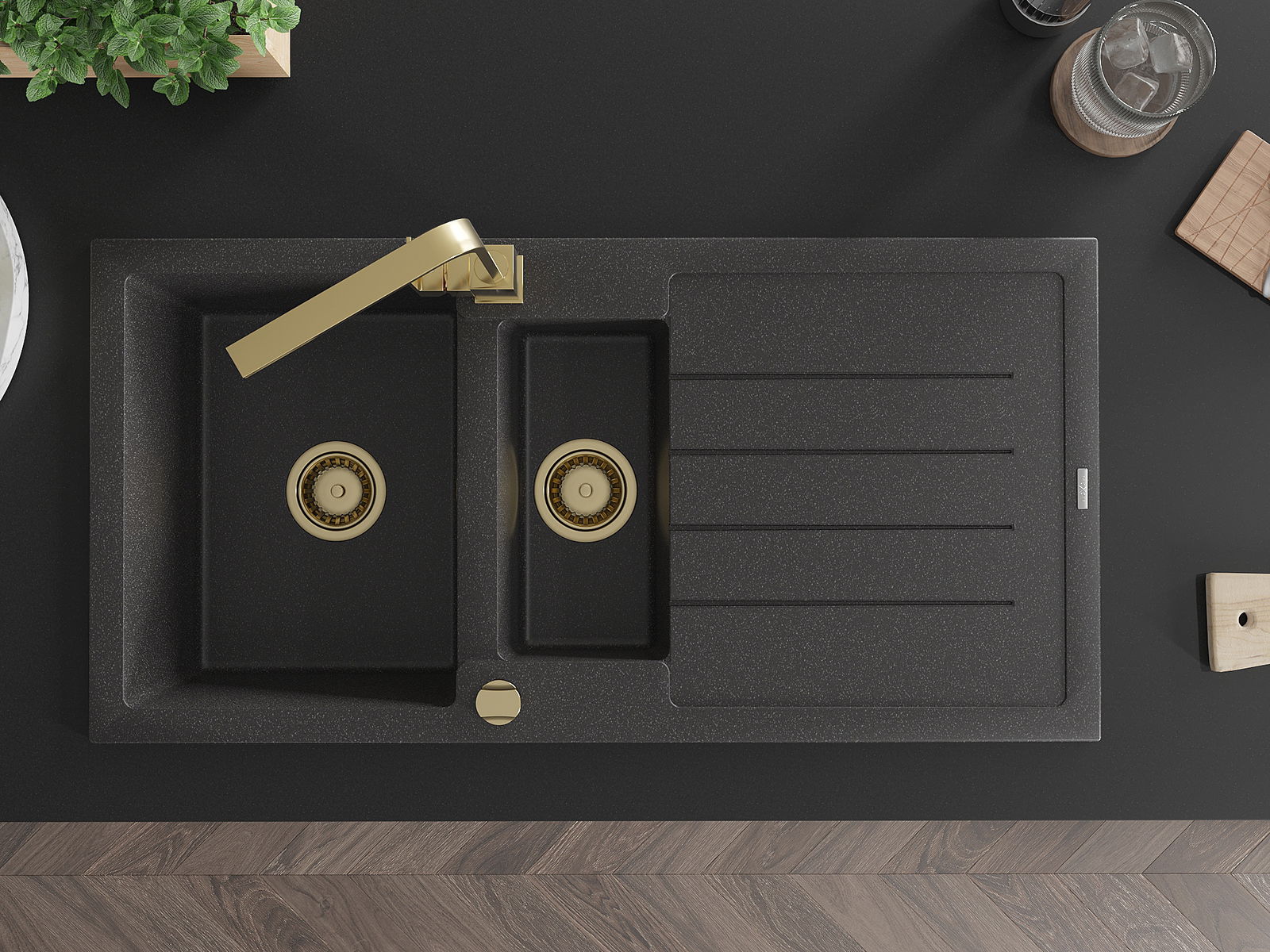 Mexen Andres 1,5 kamerų granito kriauklė su nutekėjimo lenta ir virtuviniu maišytuvu Rita, juoda su taškeliais