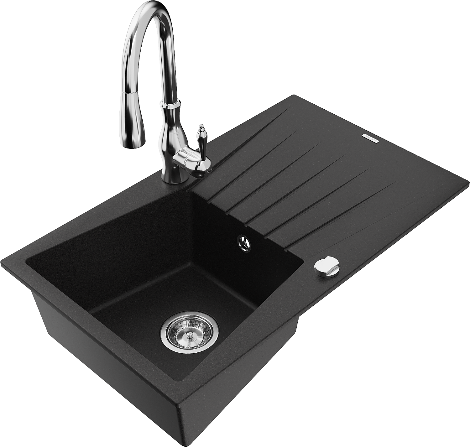 Mexen Cesar granito plautuvė su viena kamera ir nusausinimo vieta bei virtuviniu maišytuvu Savita, juoda - 6514-77-672601-00