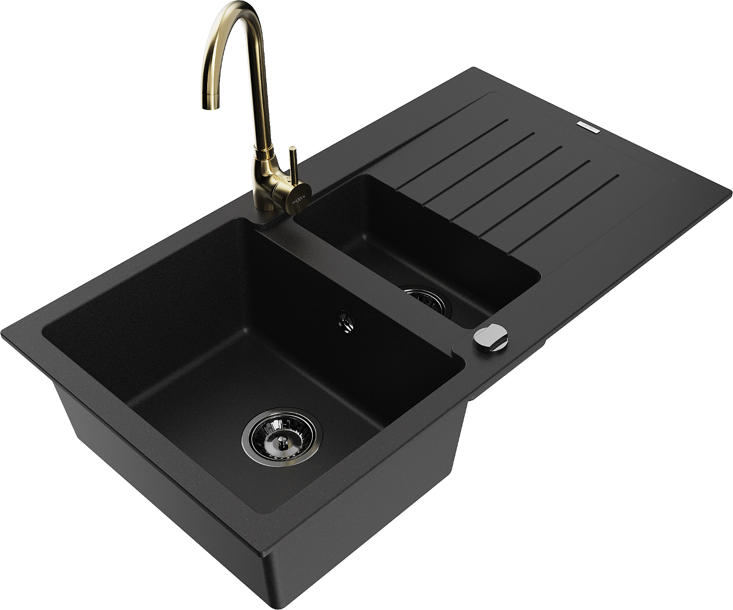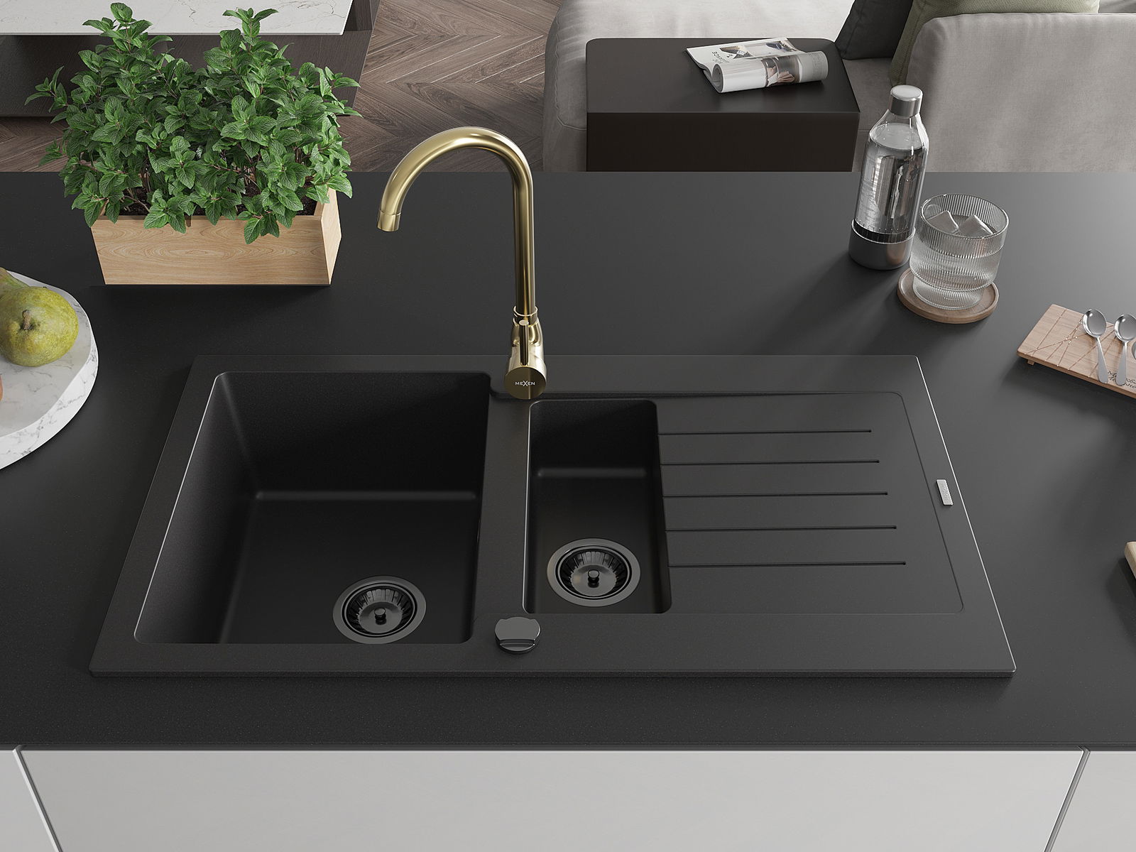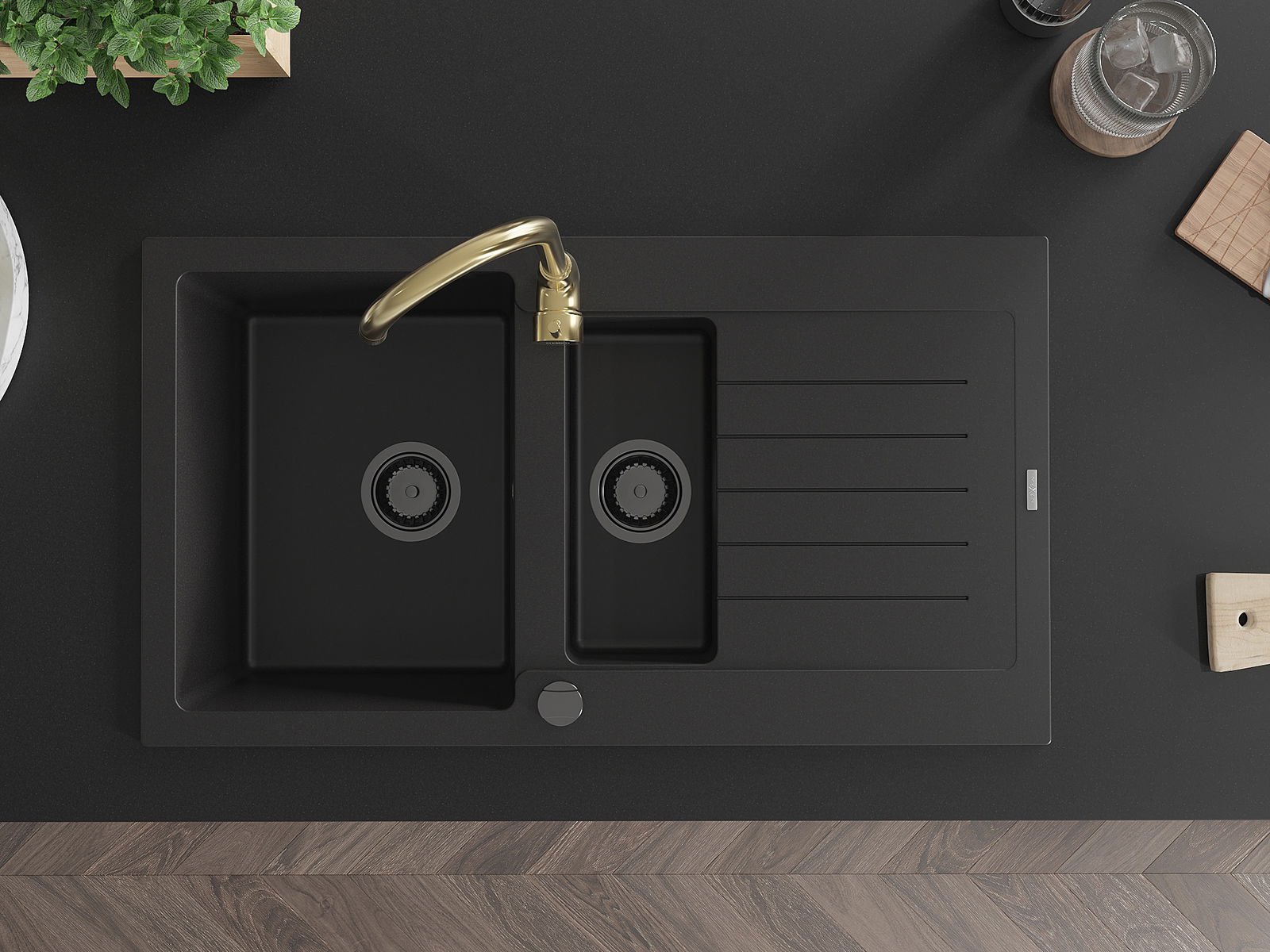 Mexen Matias granitinė 1,5 kamerų plautuvė su nutekėjimu ir virtuviniu maišytuvu Telma, juodas - 6502-77-670200-50-B