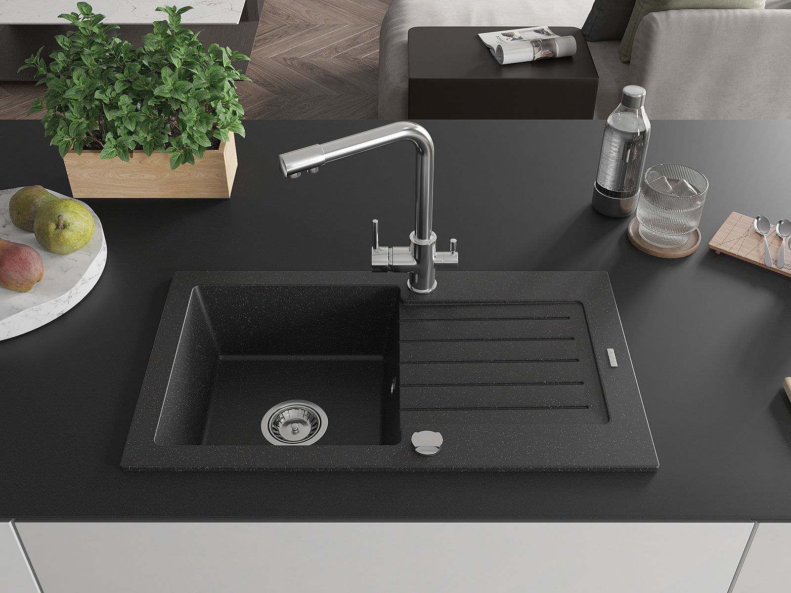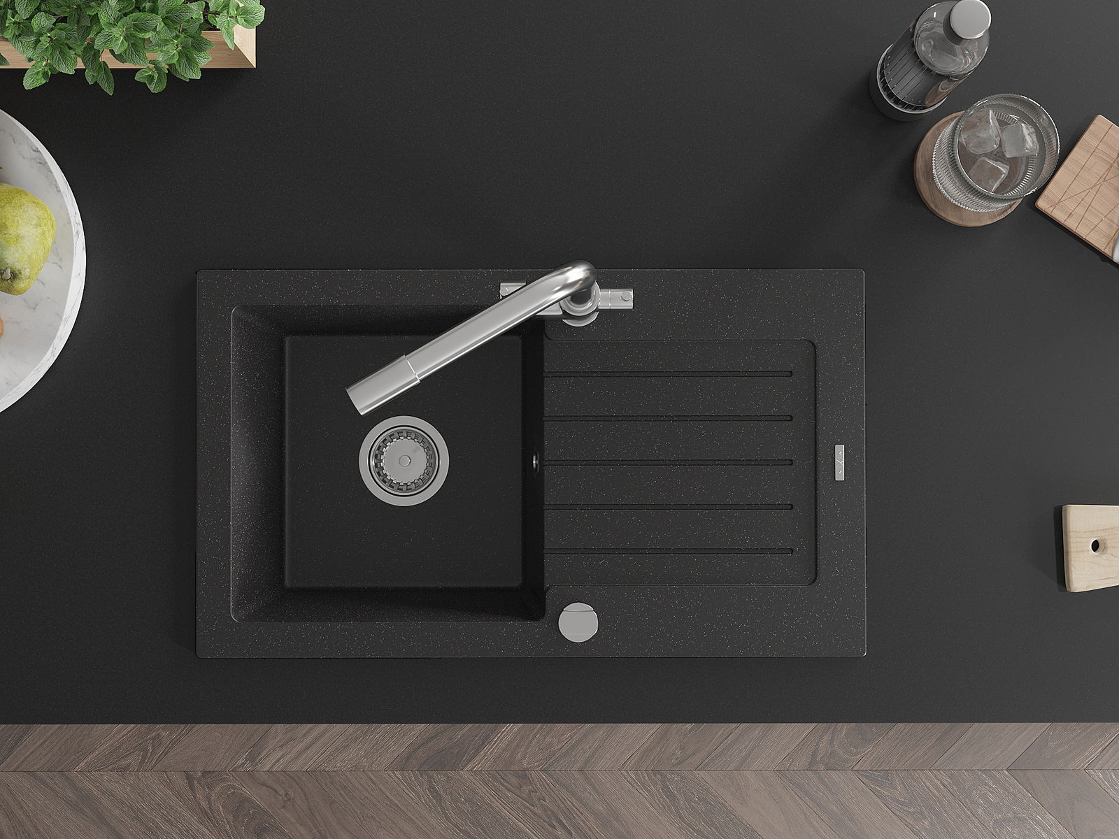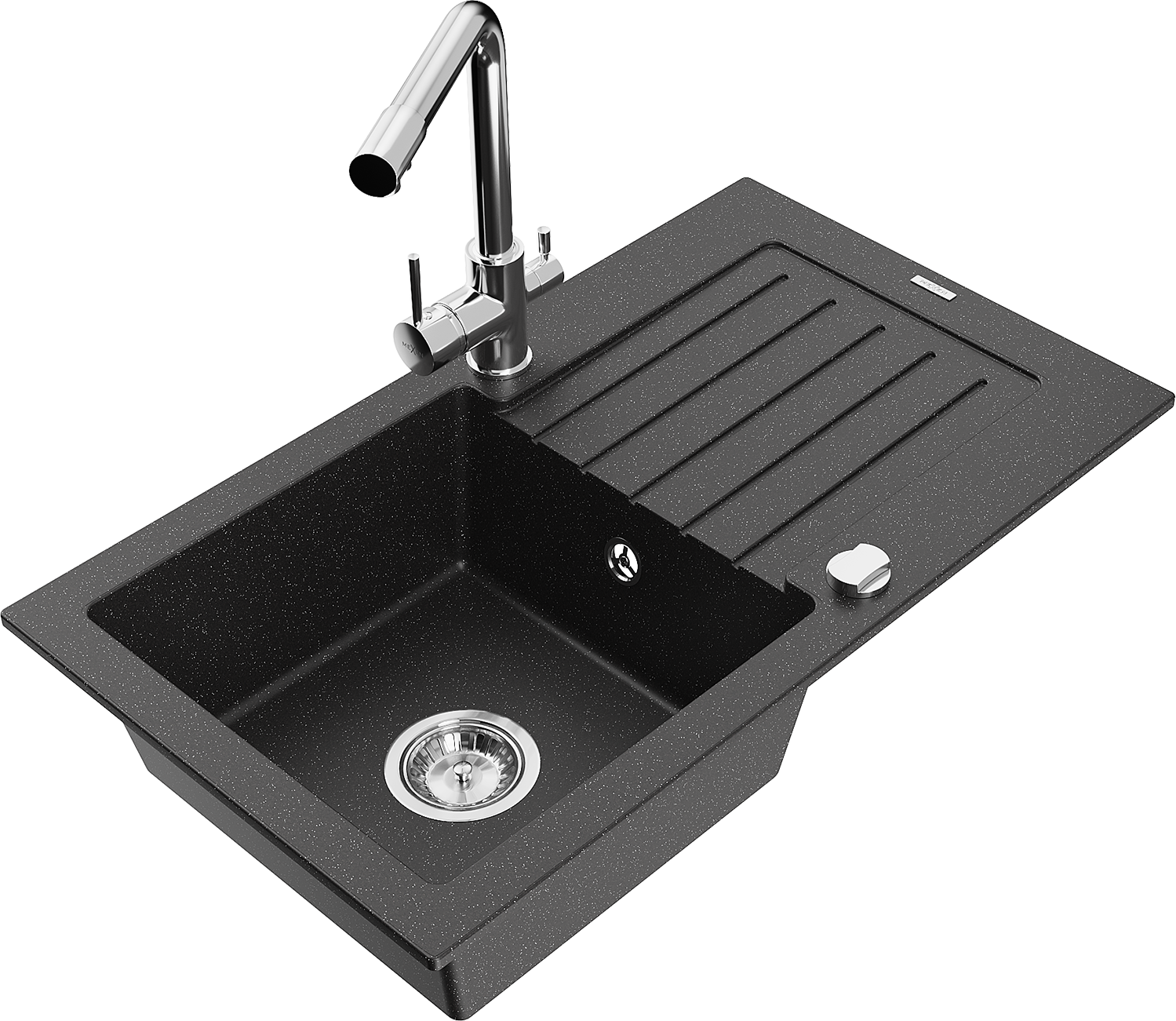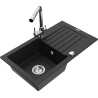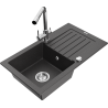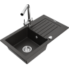 Mexen Pablo granitinė vienos kameros plautuvė su nutekamuoju dugnu ir virtuviniu maišytuvu Duero, juodos/sidabrinės metalo