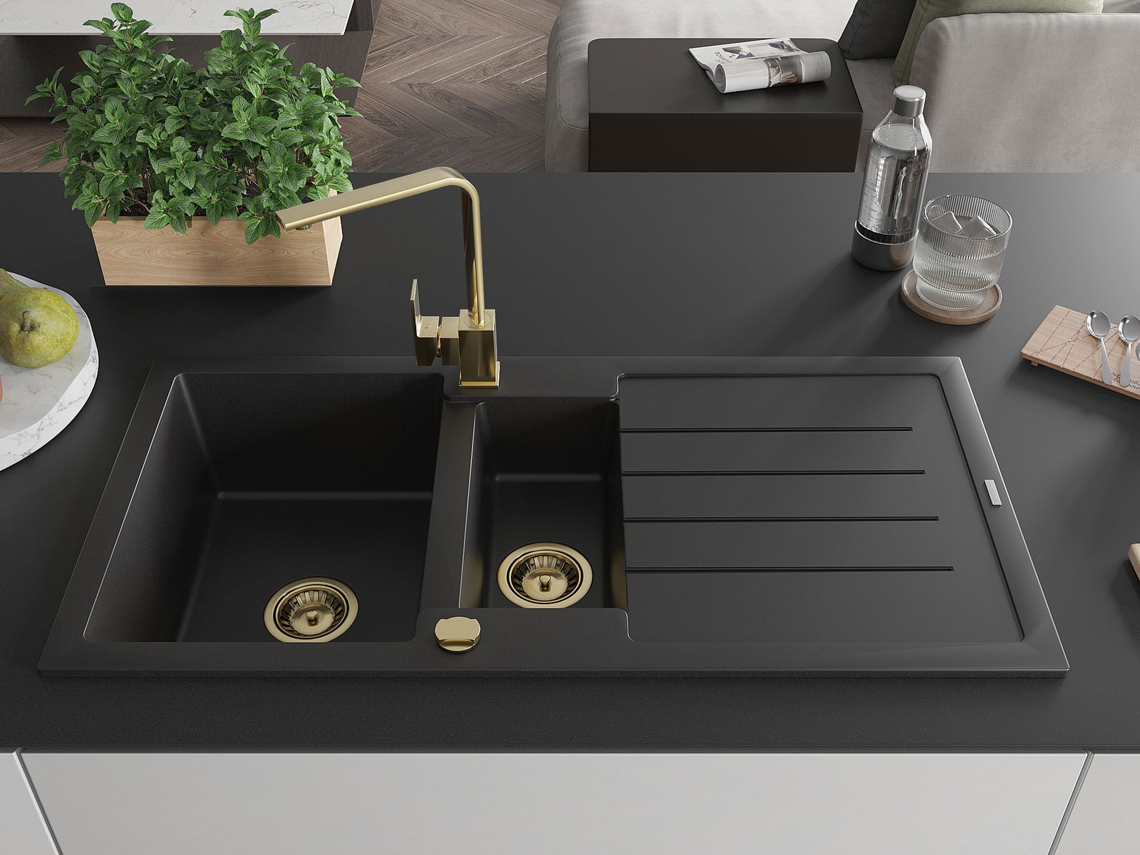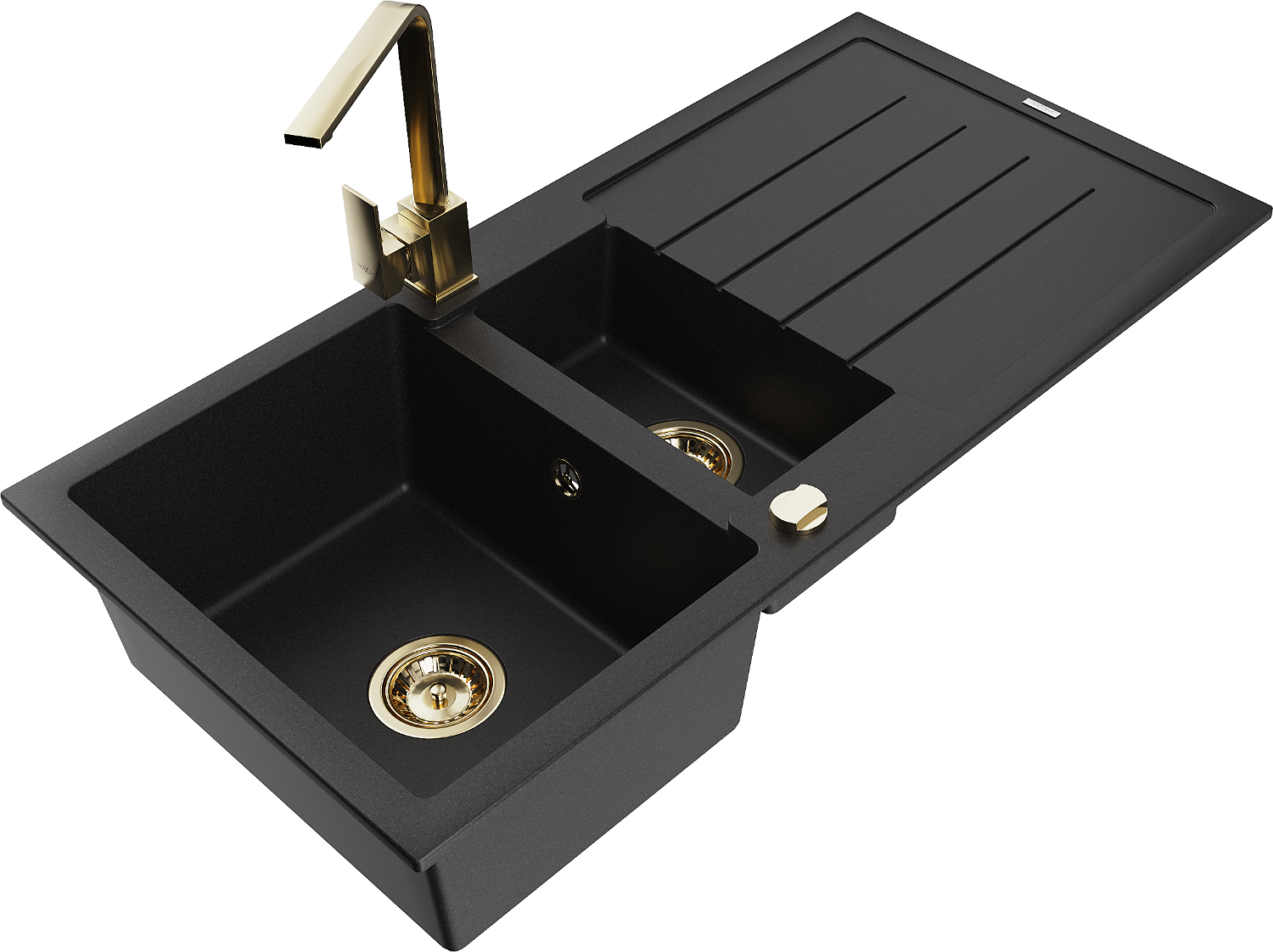 Mexen Andres granito plautuvė 1,5 kamerų su lašintuvu ir virtuviniu maišytuvu Rita, juoda - 6515-77-670300-50