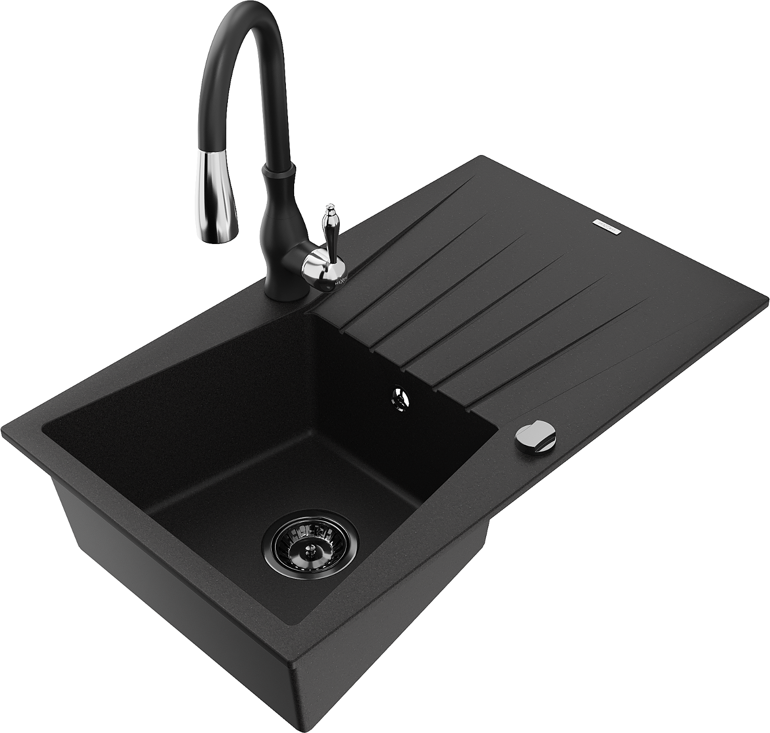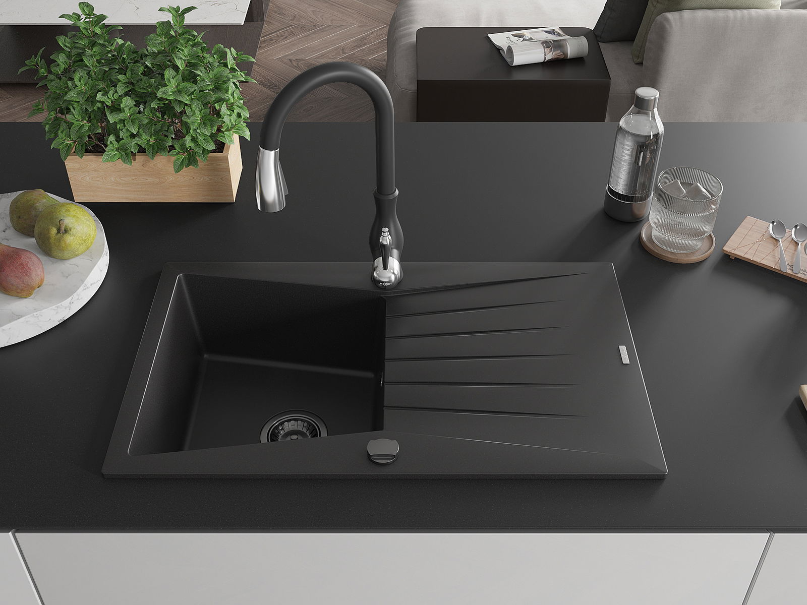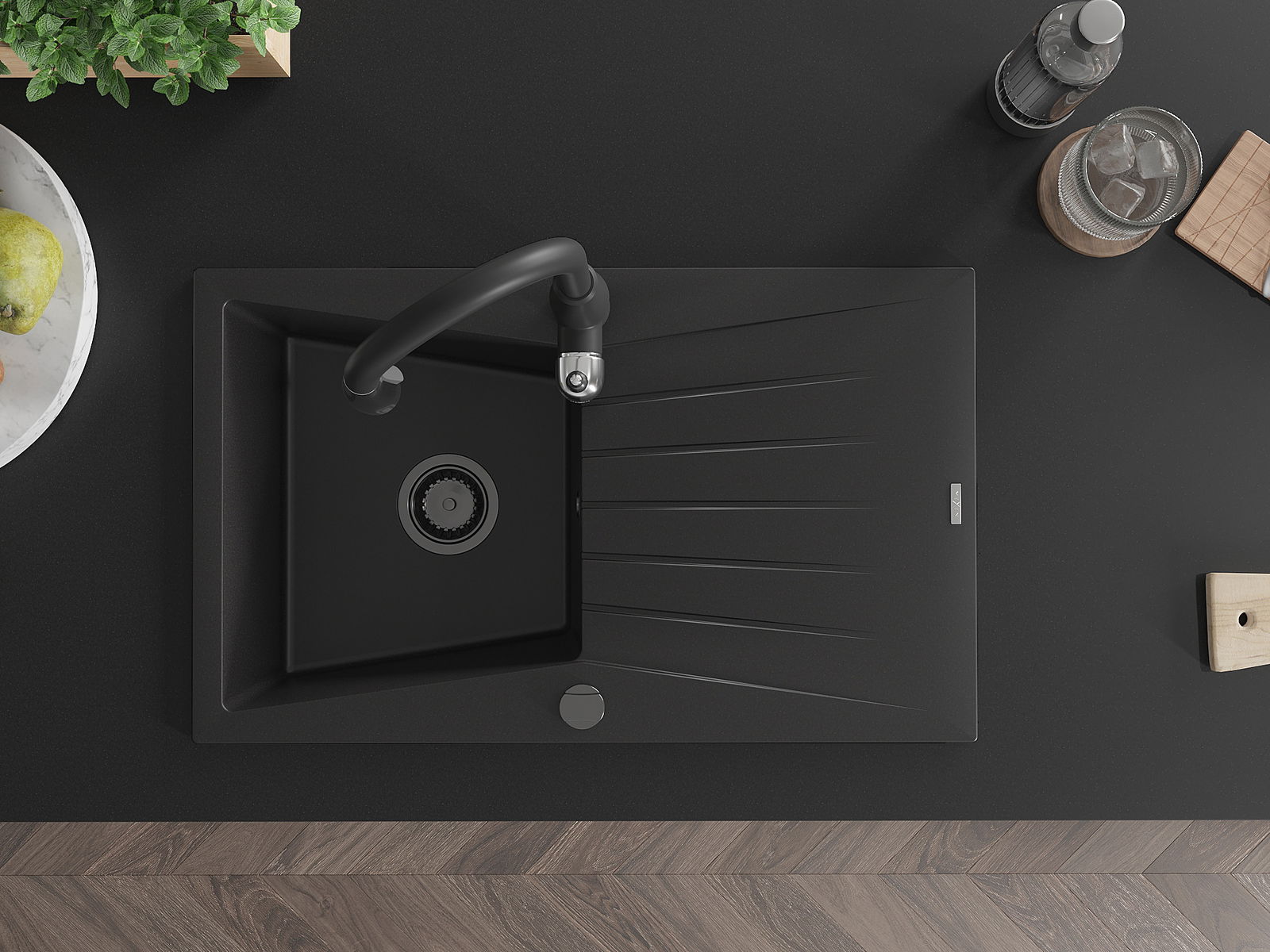 Mexen Cesar granito virtuvės kriauklė 1-aukštė su nusausintuvu ir virtuviniu maišytuvu Savita, juoda - 6514-77-672601-70-B