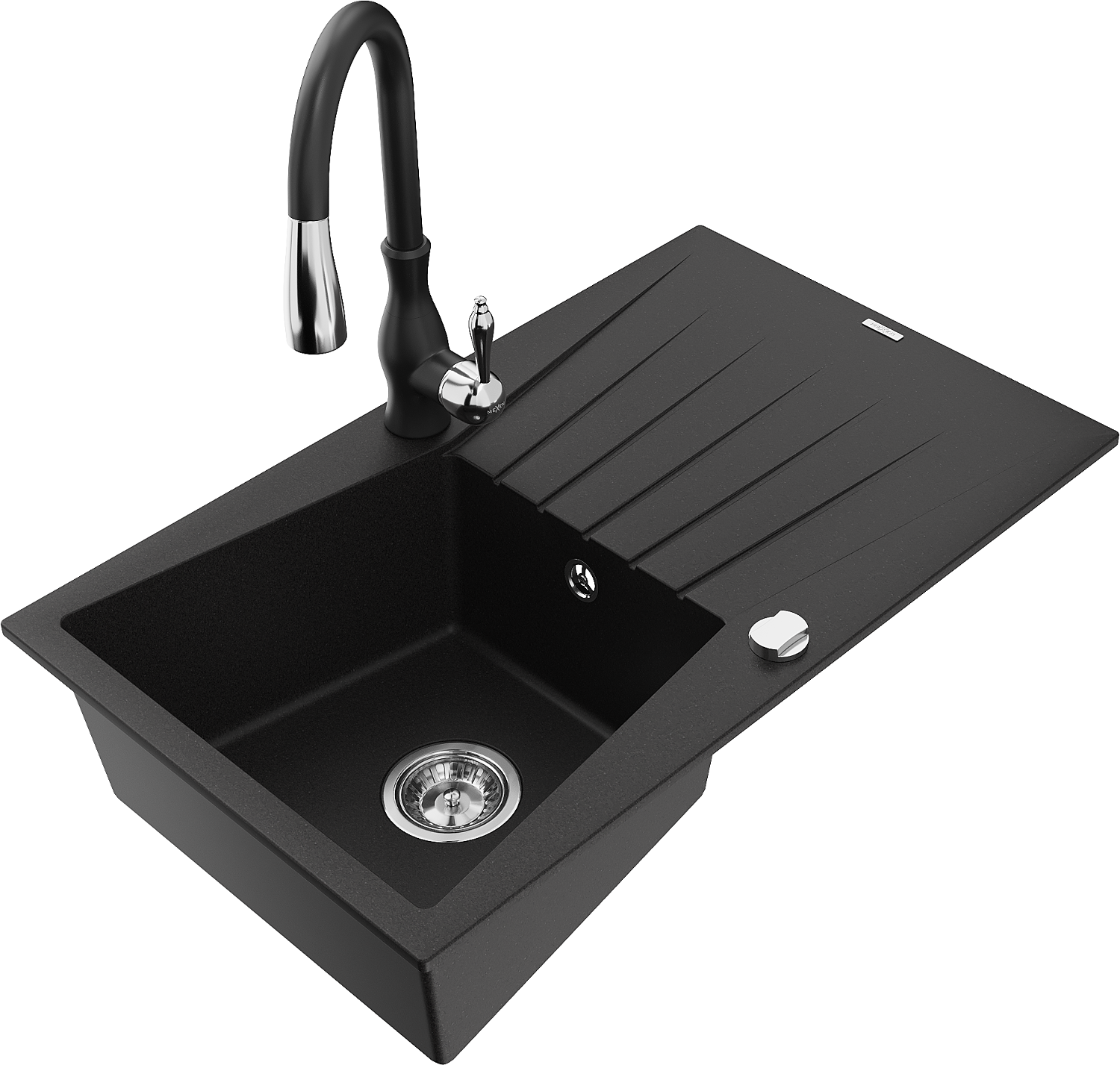 Mexen Cesar granitinis vienos kameros plautuvas su nutekėjimo lenta ir virtuviniu maišytuvu Savita, juodas - 6514-77-672601-70