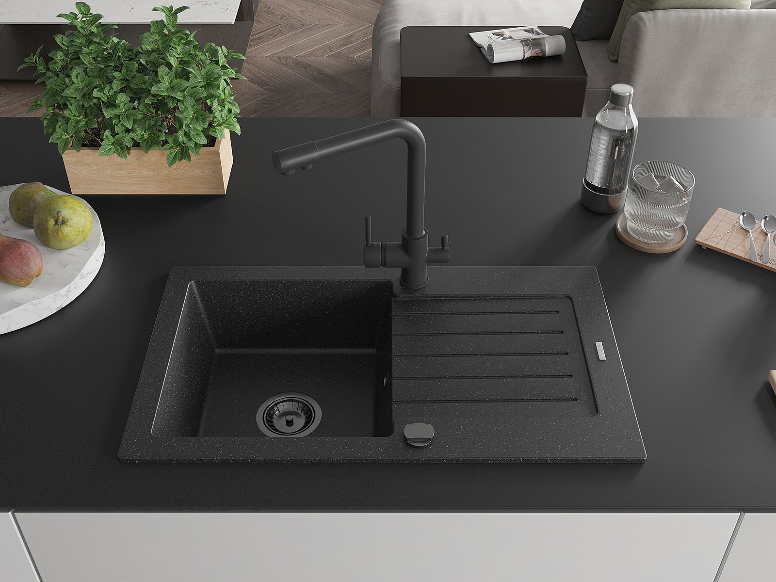 Mexen Pablo grindinis vienos kameros plautuvas su lašintuvu ir virtuviniu maišytuvu Duero, juoda/sidabrinė metalika