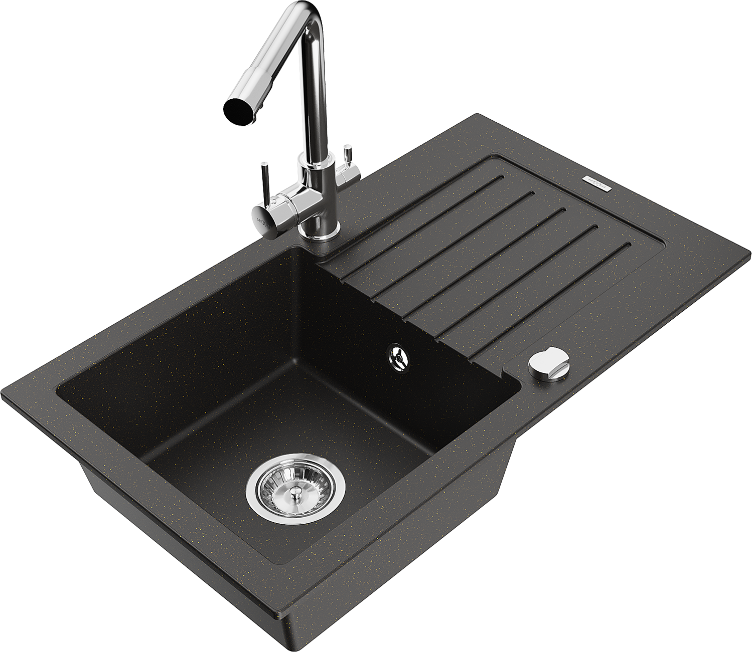 Mexen Pablo granitinė praustuvė su viena kamera, Nutekėjimo skyriumi ir virtuviniu maišytuvu Duero, juodas/auksinis