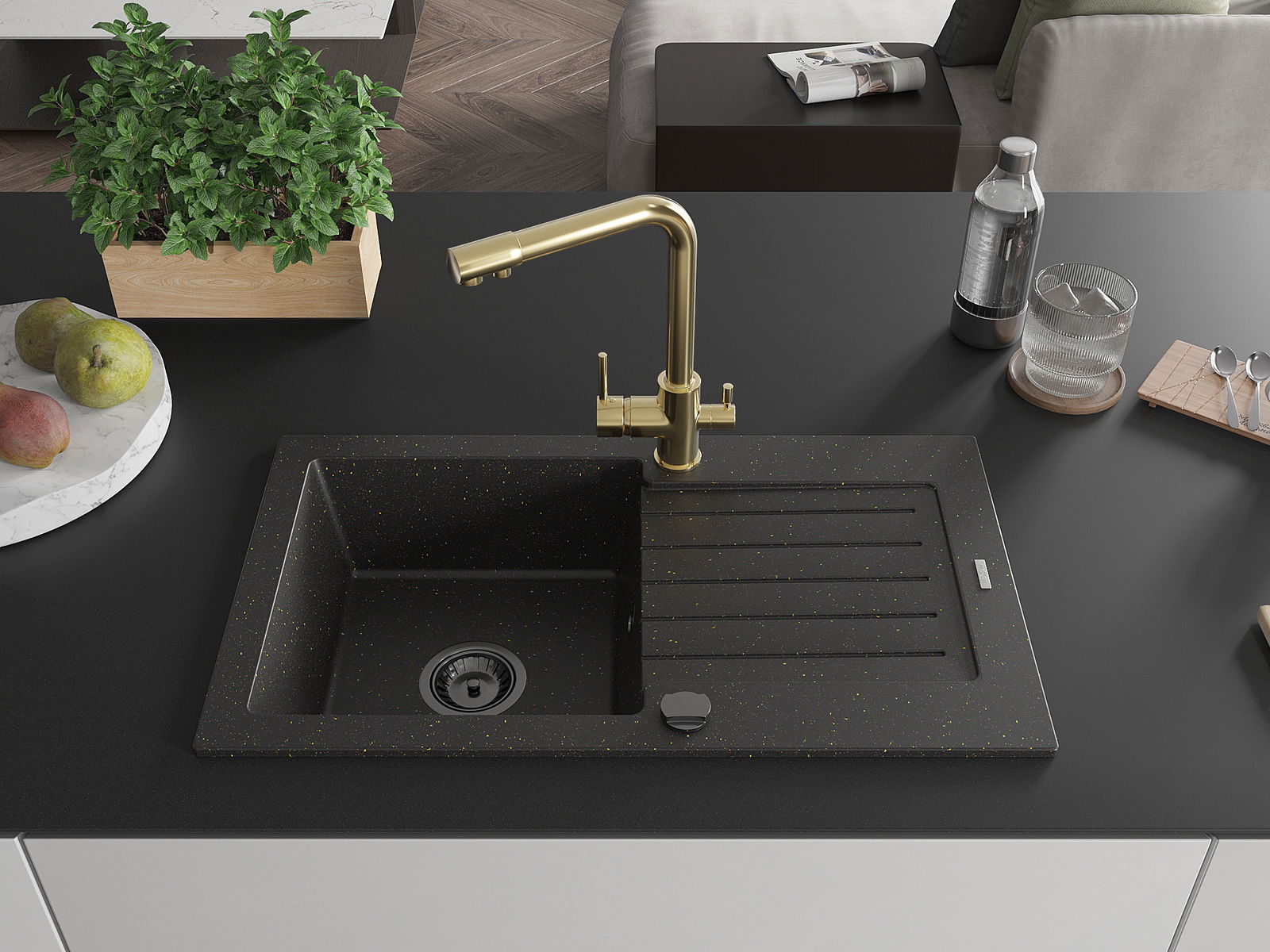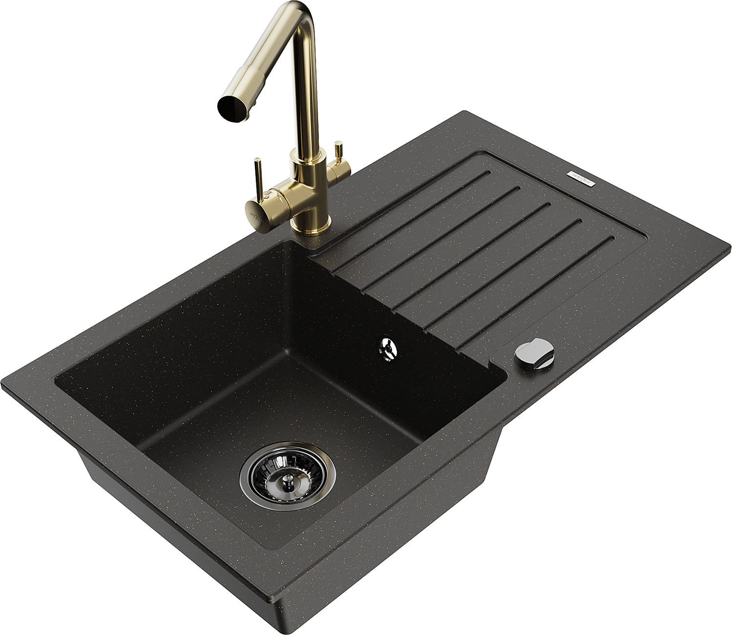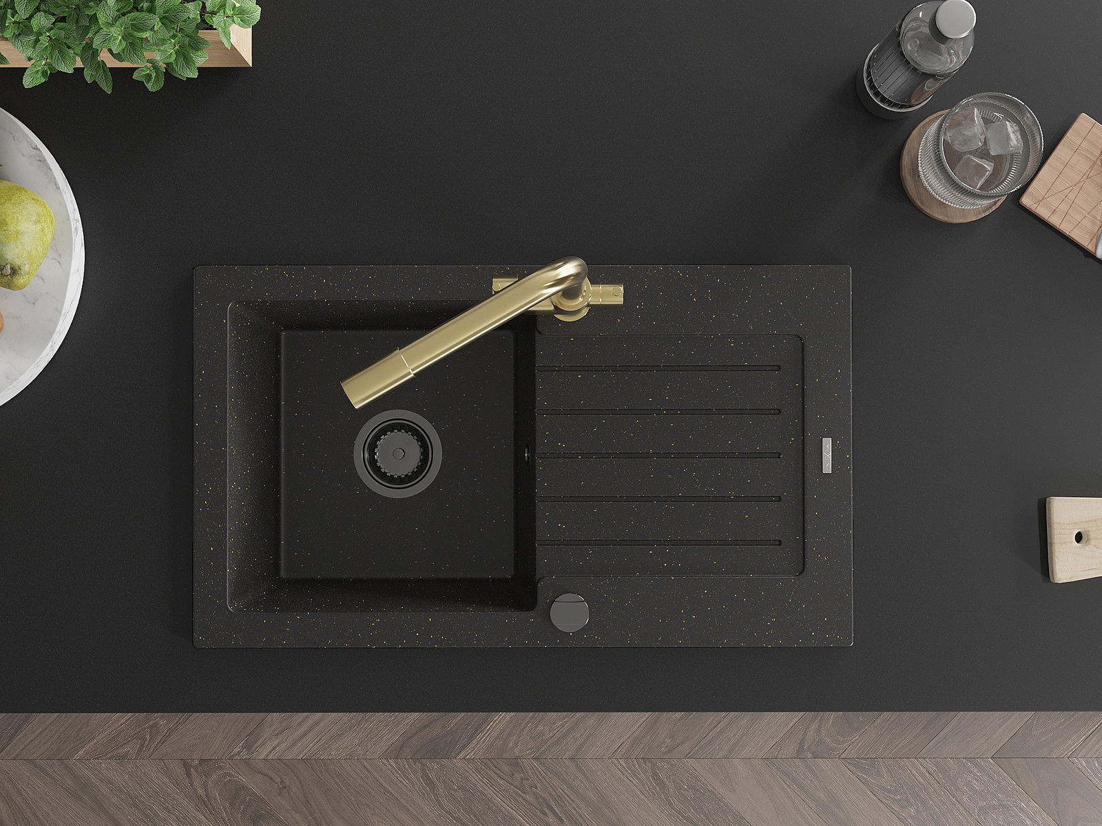 Mexen Pablo 1 kamerų granito plautuvė su nusausintuvu ir virtuviniu maišytuvu Duero, juodos/auksinės spalvos metalikas