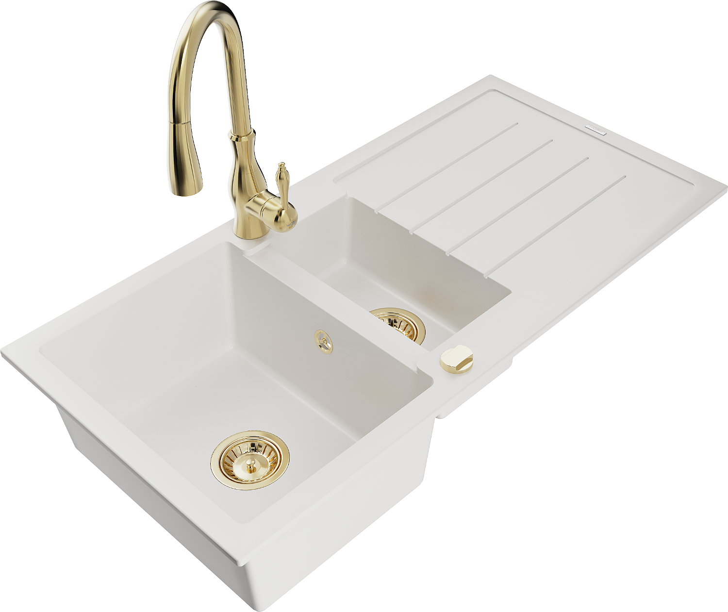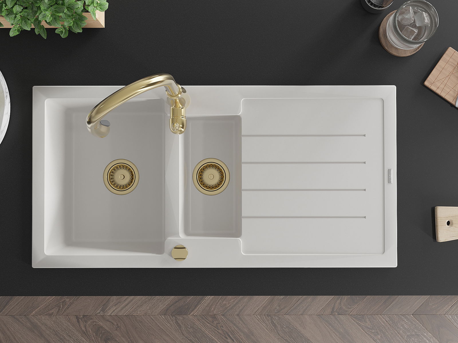 Mexen Andres granitinė 1,5 kamerų plautuvė su nusausintuvu ir virtuviniu maišytuvu Savita, balta - 6515-20-672601-50
