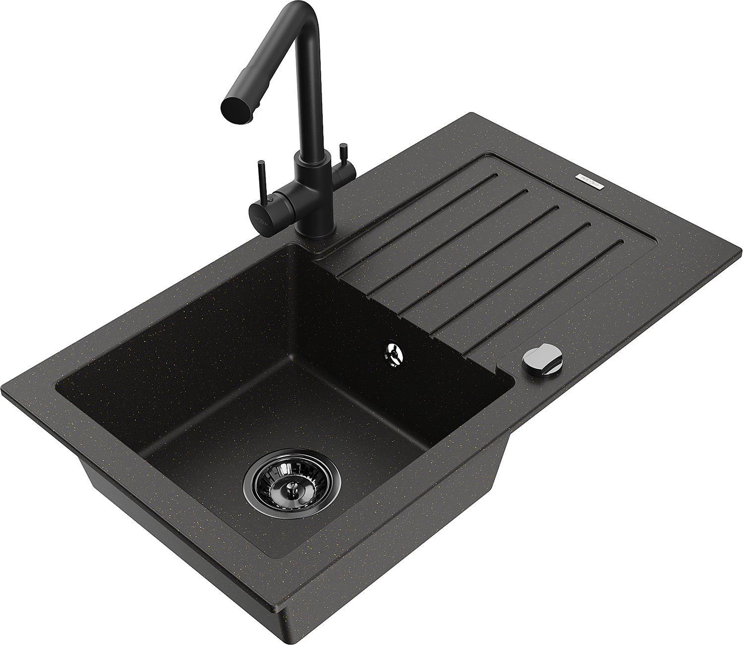 Mexen Pablo granitinė vienos kameros plautuvė su drenažu ir virtuviniu maišytuvu Duero, juodas/auksinis metalikas