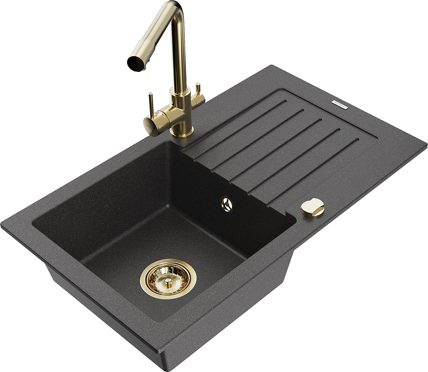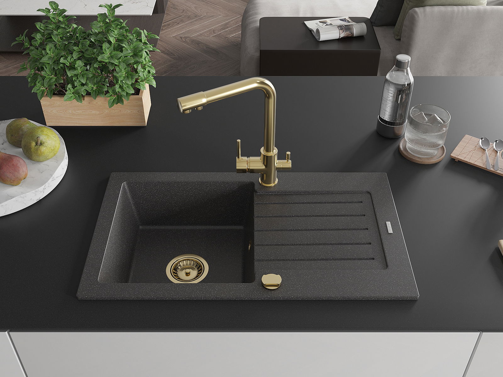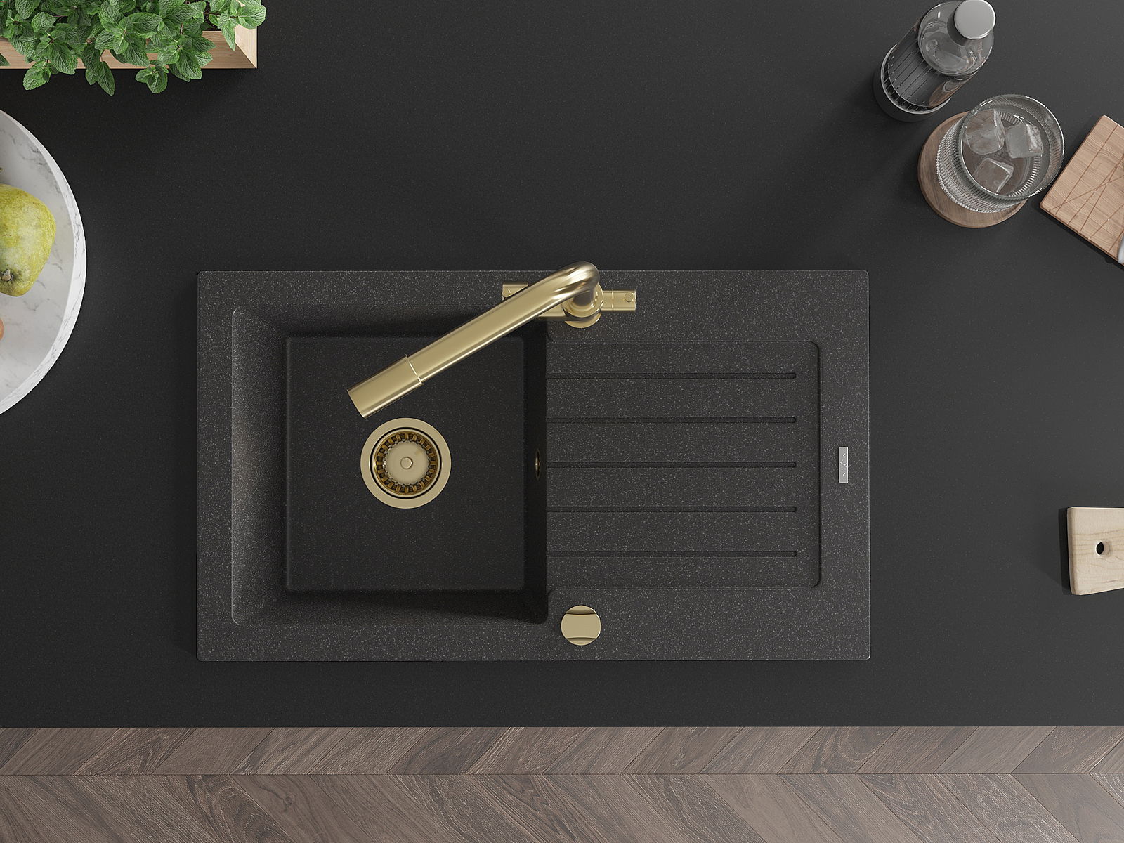 Mexen Pablo granitinė vienos kameros kriauklė su nusausintuvu ir virtuviniu maišytuvu Duero, juoda dėmėta