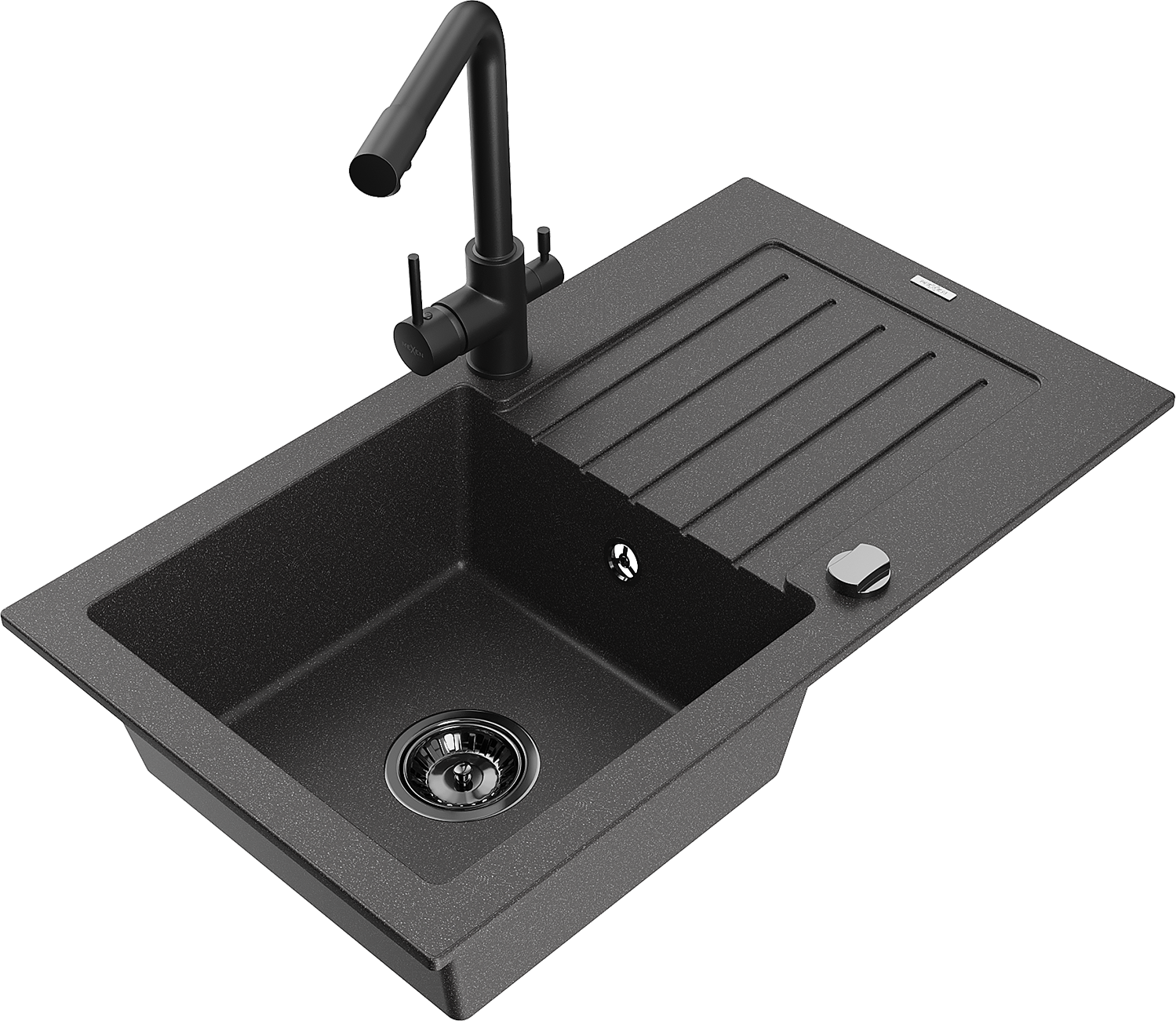Mexen Pablo granitinė vienos kameros kriauklė su džiovykla ir virtuvės čiaupu Duero, juoda su taškeliais