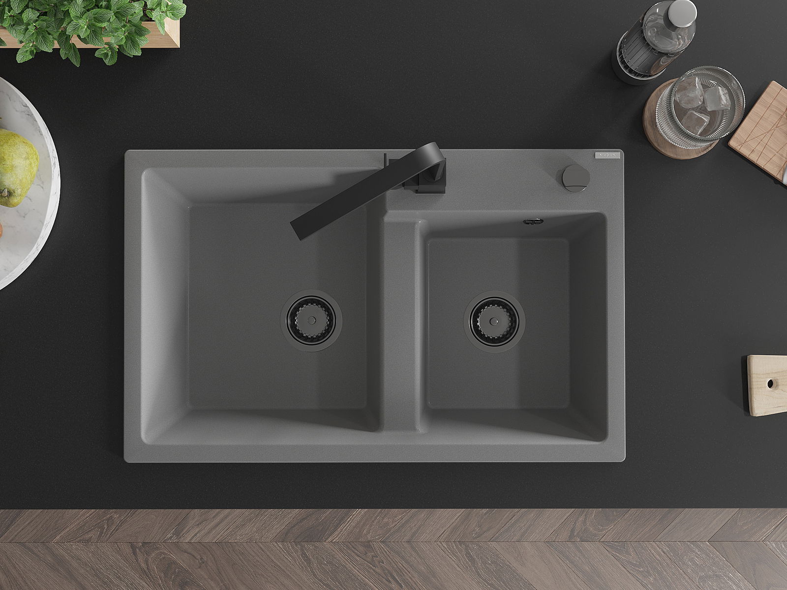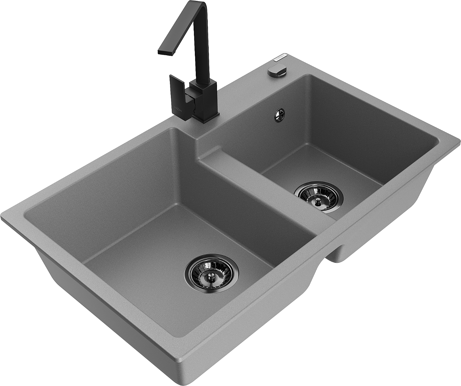 Mexen Tomas dviejų skyrių granito plautuvė su virtuviniu maišytuvu Rita, pilka - 6516-71-670300-70-B