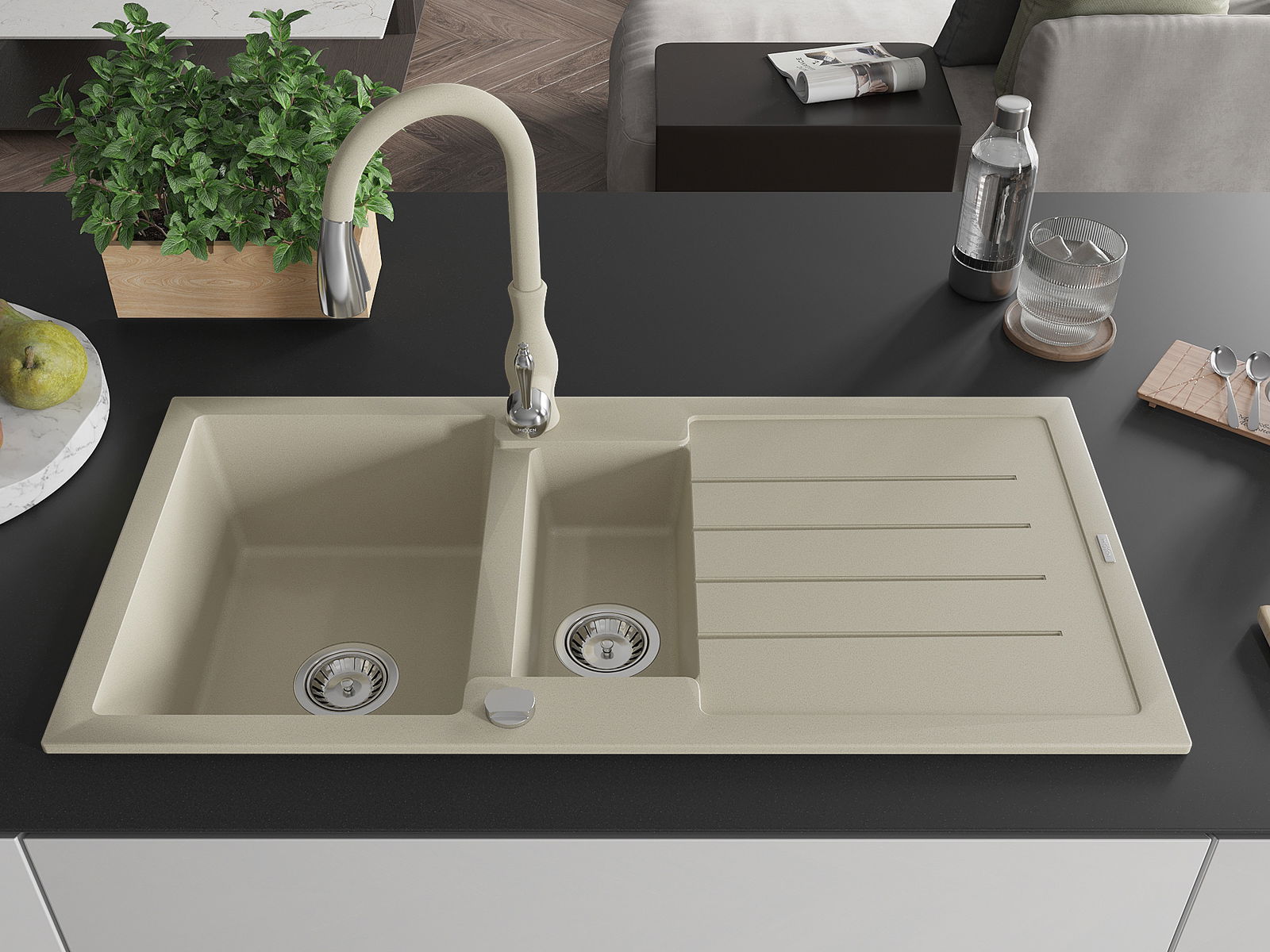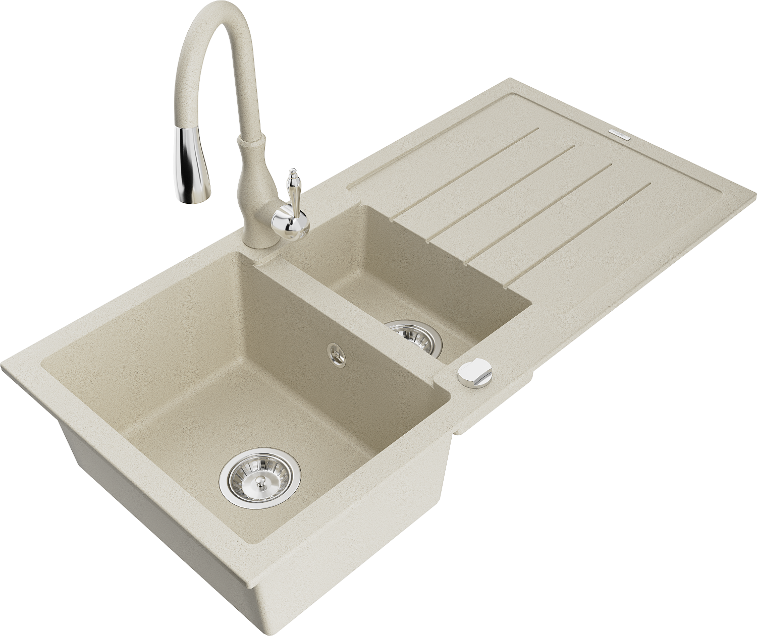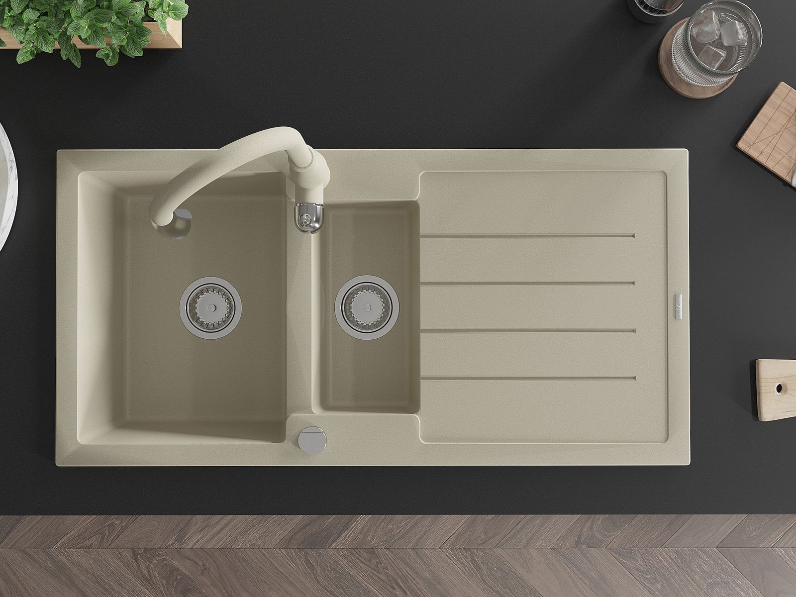 Mexen Andres 1,5 kamerų granitinė kriauklė su nusausintuvu ir virtuviniu maišytuvu Savita, smėlio spalvos
