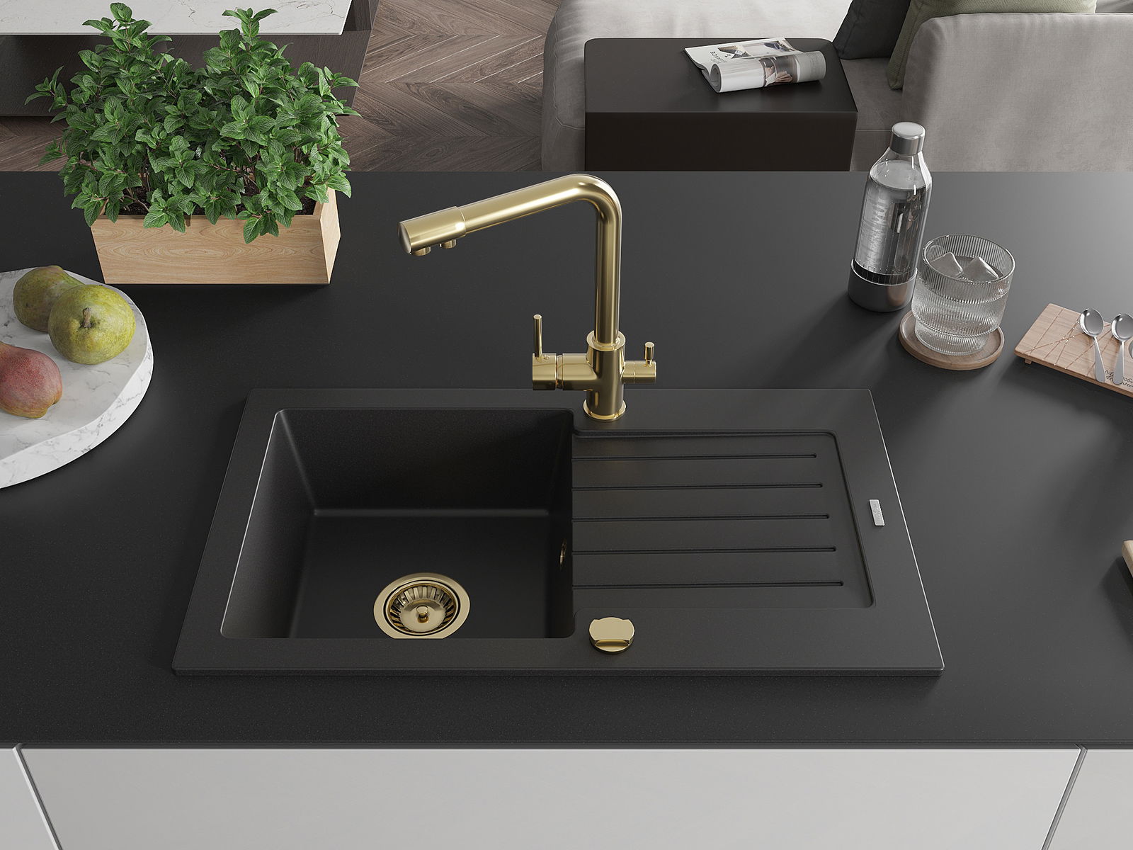 Kriauklė turi 2 iš anksto frezuotas skyles, kurių skersmuo yra 35 mm, skirtas savarankiškam išmušimui. Jas galima naudoti, pavyzdžiui, skysčio dozatoriaus montavimui, kuris pašalins plastikinių butelių buvimą virtuvėje ir suteiks jai elegantišką apdailą.