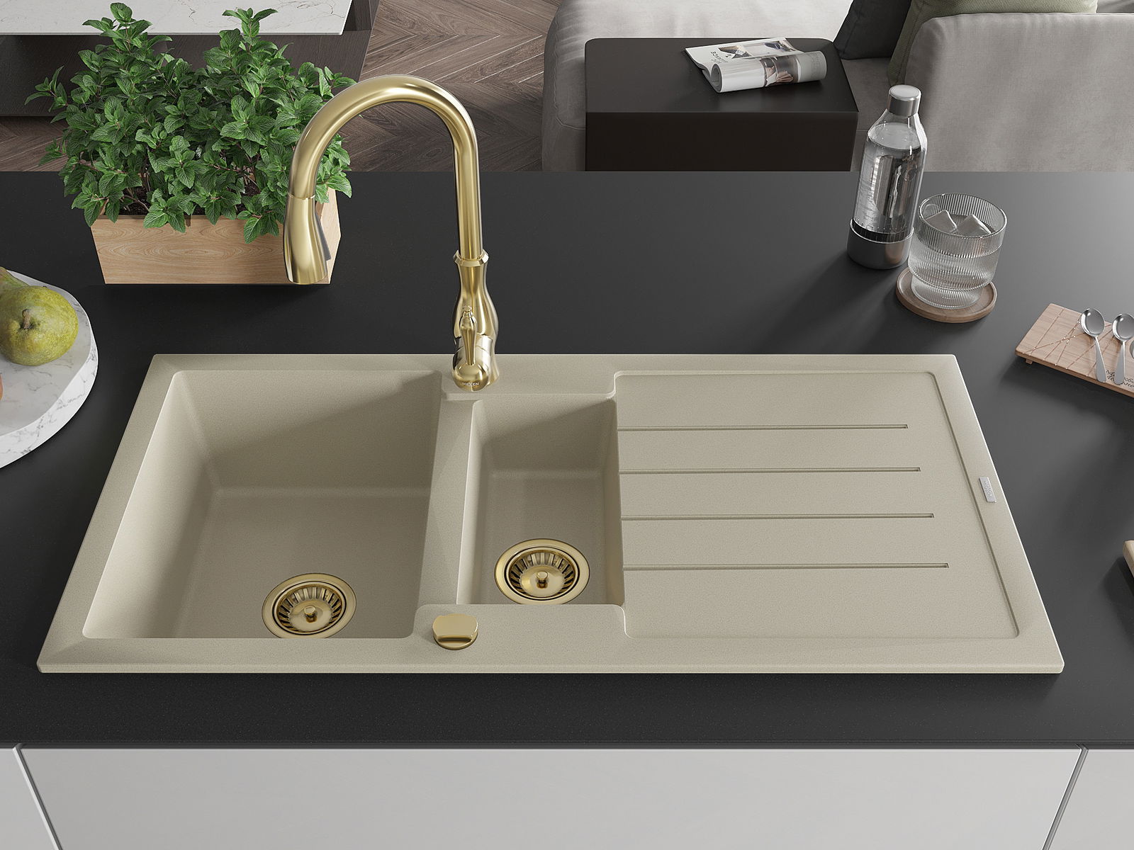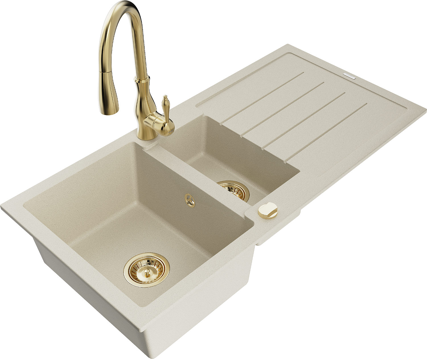 Mexen Andres granitinė 1,5 dubens kriauklė su nusausintuvu ir virtuviniu maišytuvu Savita, smėlio spalvos