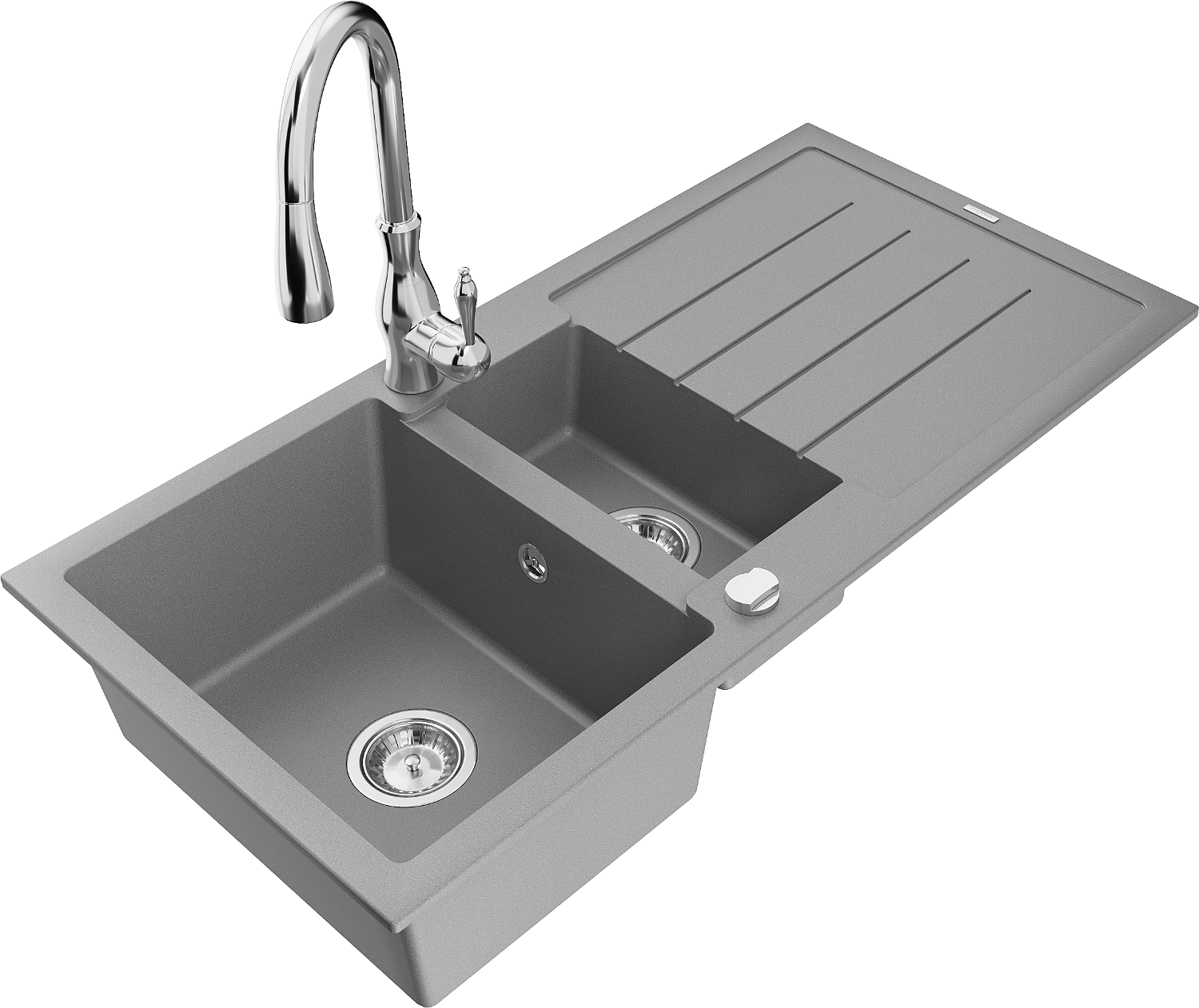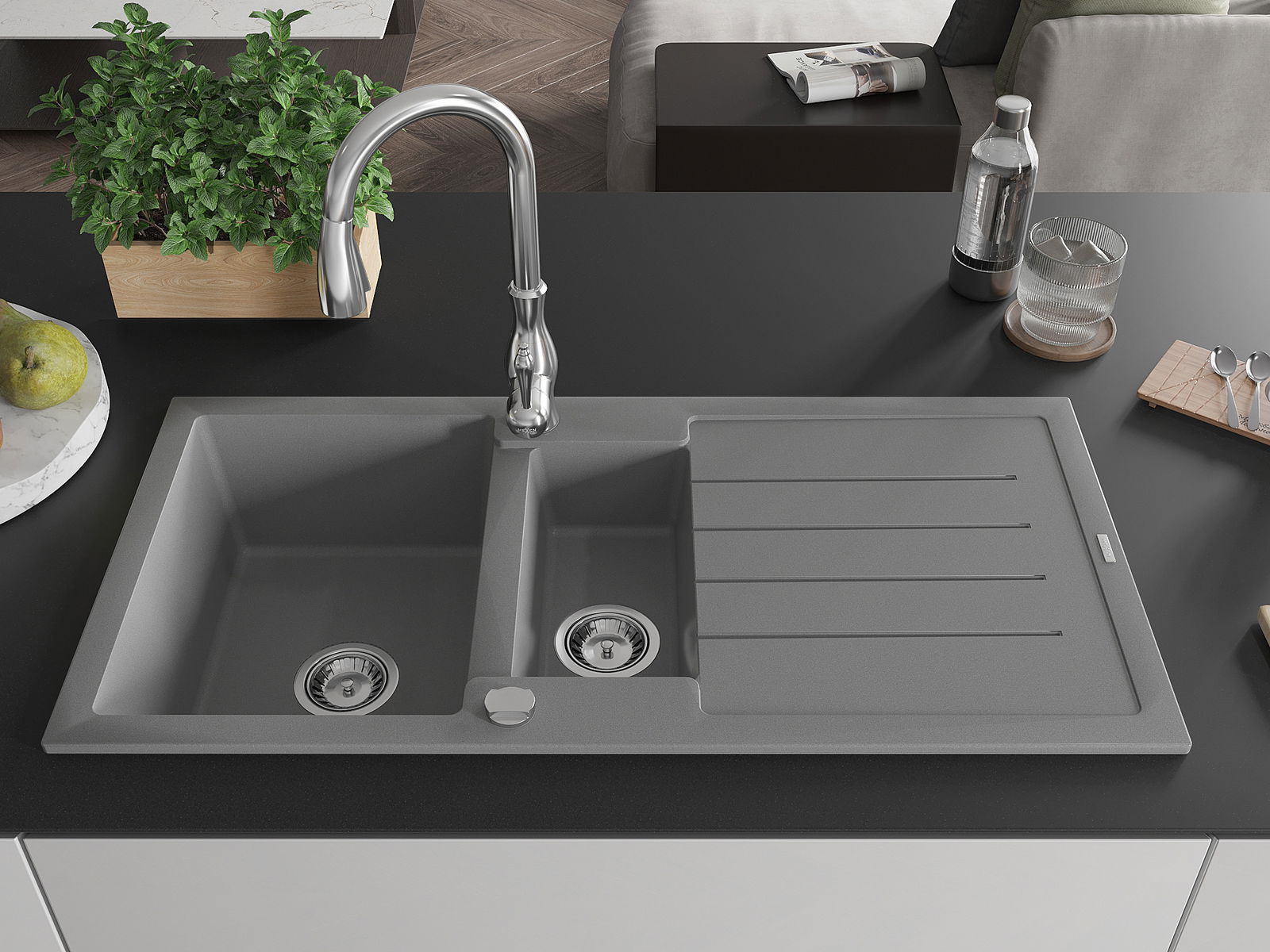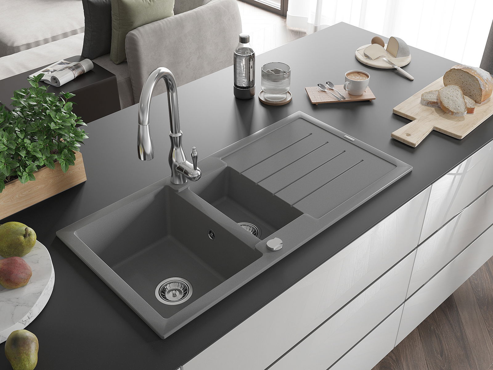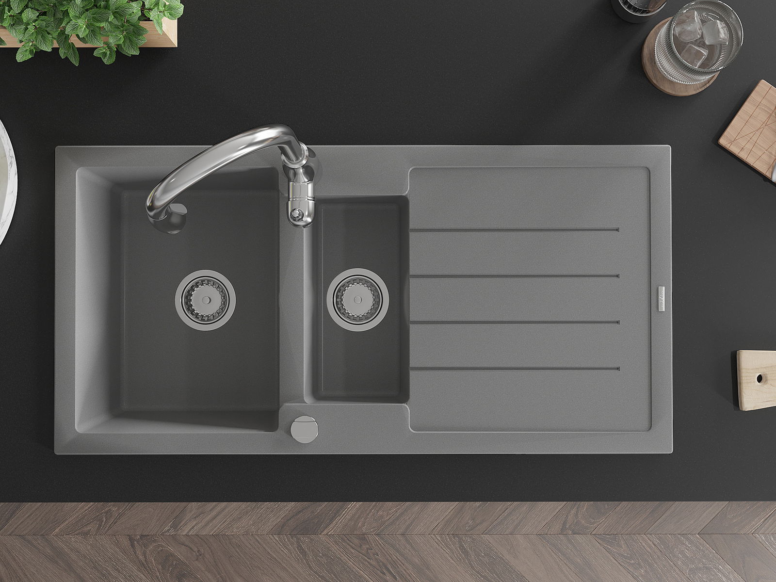 Mexen Andres granitinis plautuvė 1,5 skylių su nutekėjimu ir virtuvinis maišytuvas Savita, pilka - 6515-71-672601-00