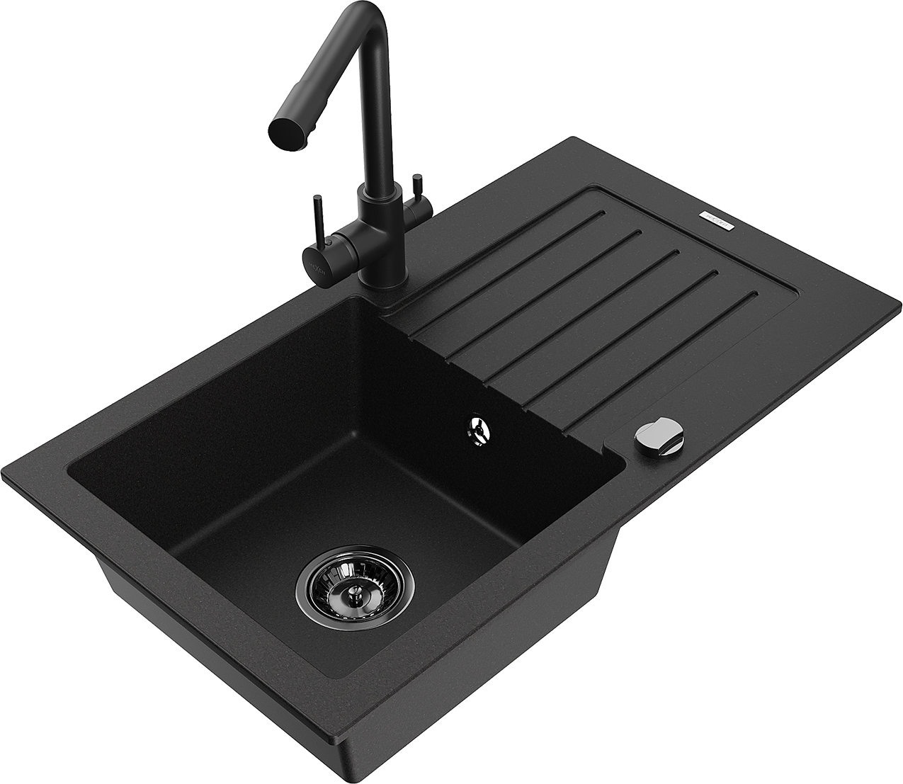 Mexen Pablo granitinė vienos sekcijos plautuvė su nusausintuvu ir virtuviniu maišytuvu Duero, juoda - 6510-77-671600-70-B