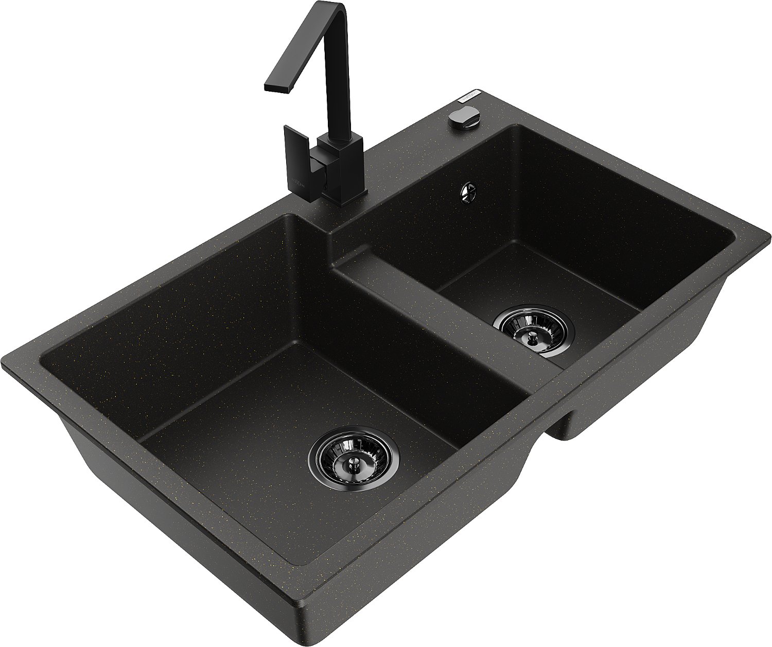 Mexen Tomas dviejų kamerų granitinė virtuvės kriauklė su maišytuvu Rita, juoda/auksinė metalo - 6516-75-670300-70-B