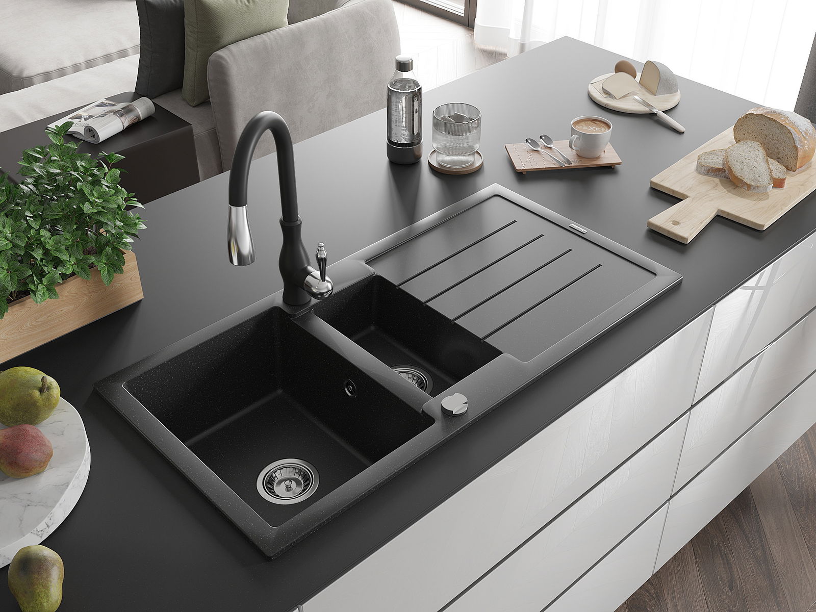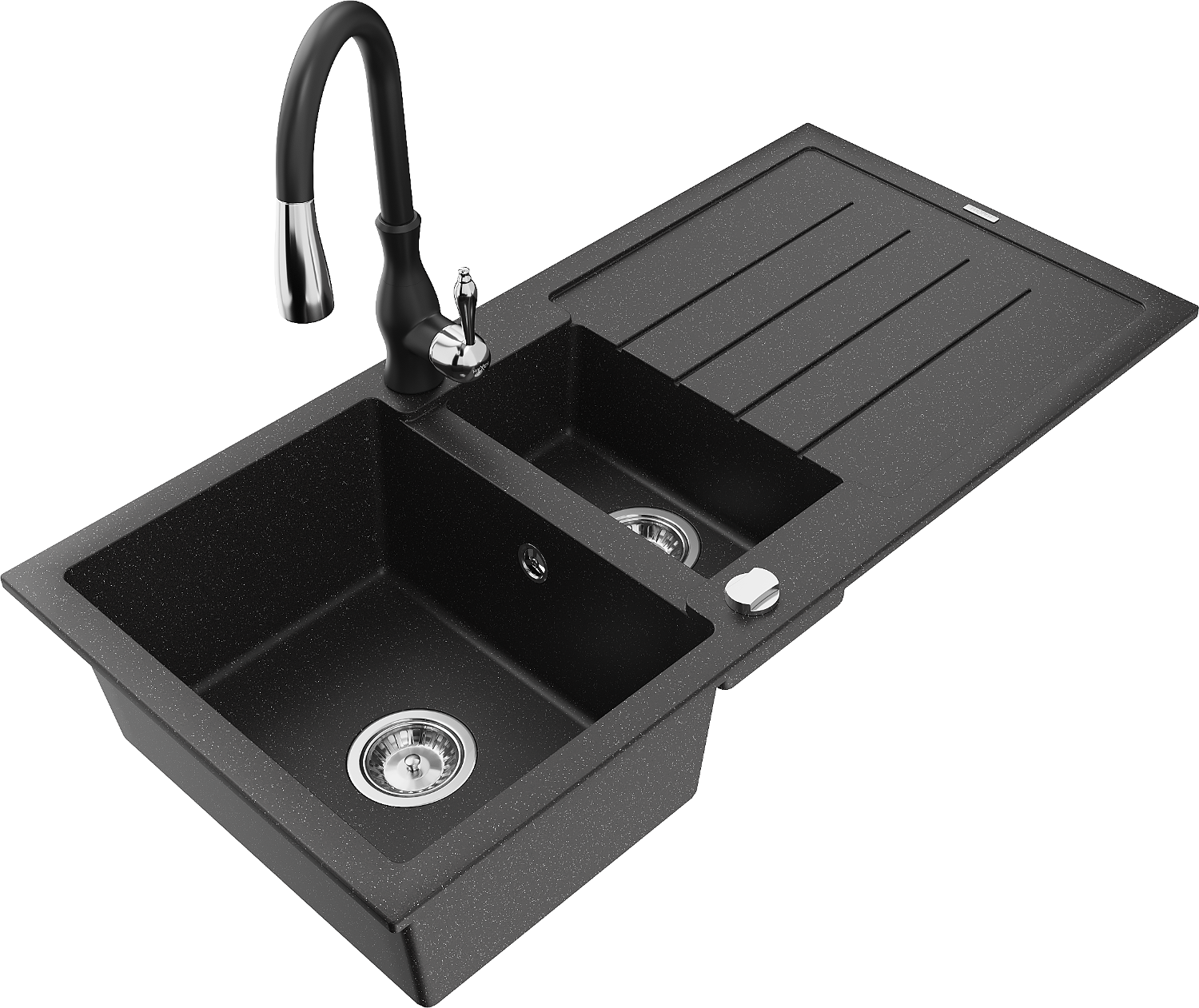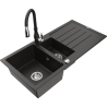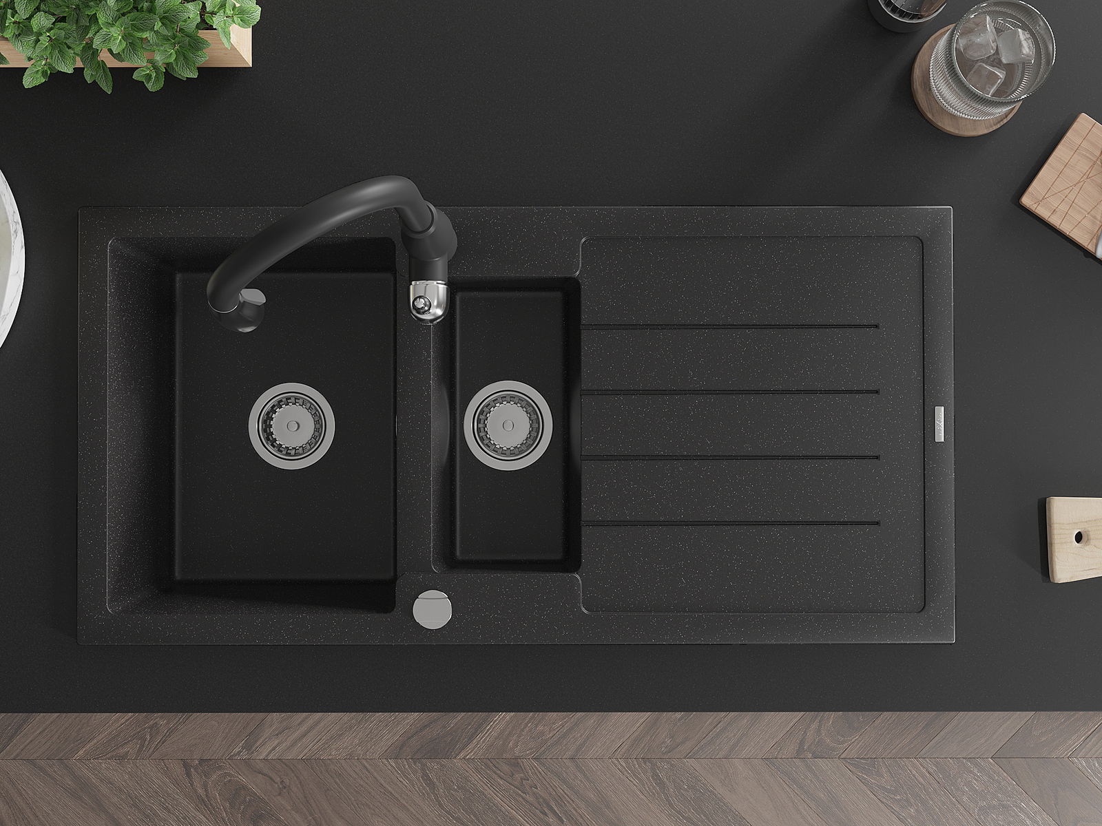 Mexen Andres 1,5 skylių granitinė plautuvė su nutekamu ir virtuviniu maišytuvu Savita, juodas/sidabrinis - 6515-73-672601-70