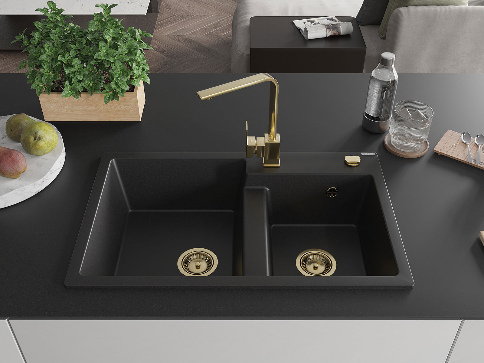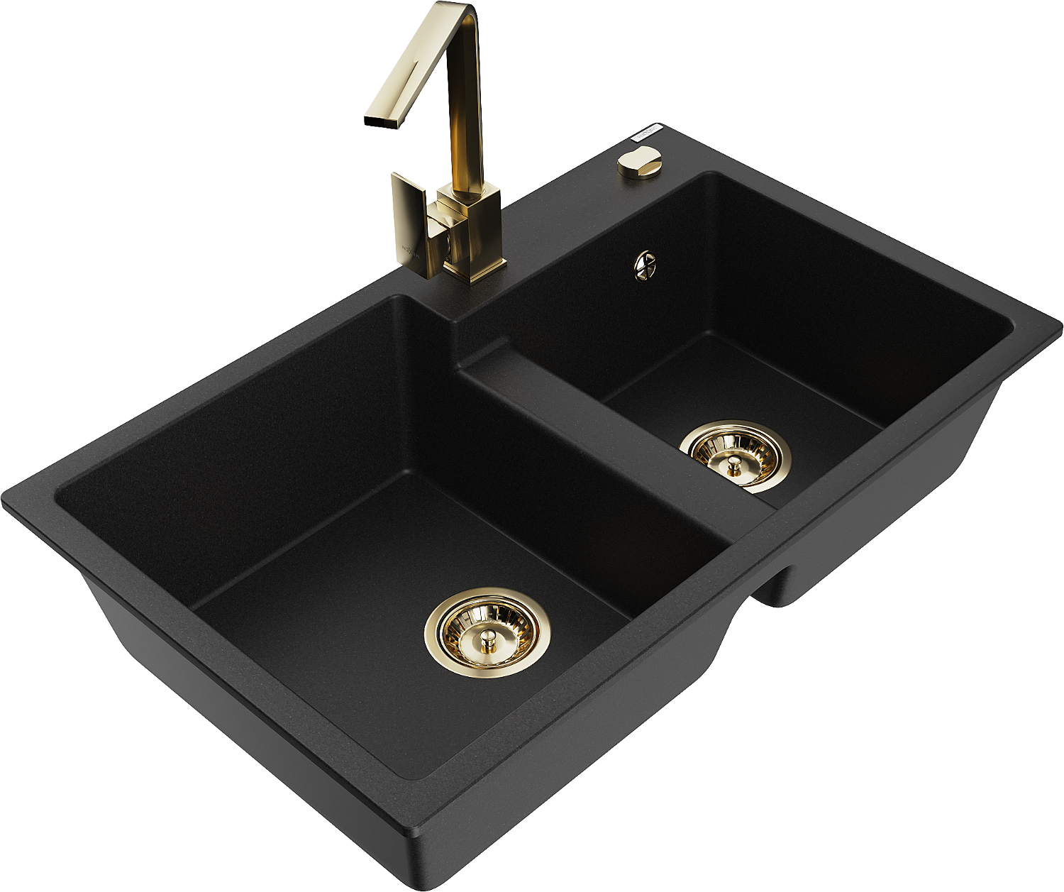 Mexen Tomas 2-jų skyrių granitinė plautuvė su Rita virtuviniu maišytuvu, juoda - 6516-77-670300-50
