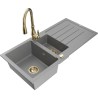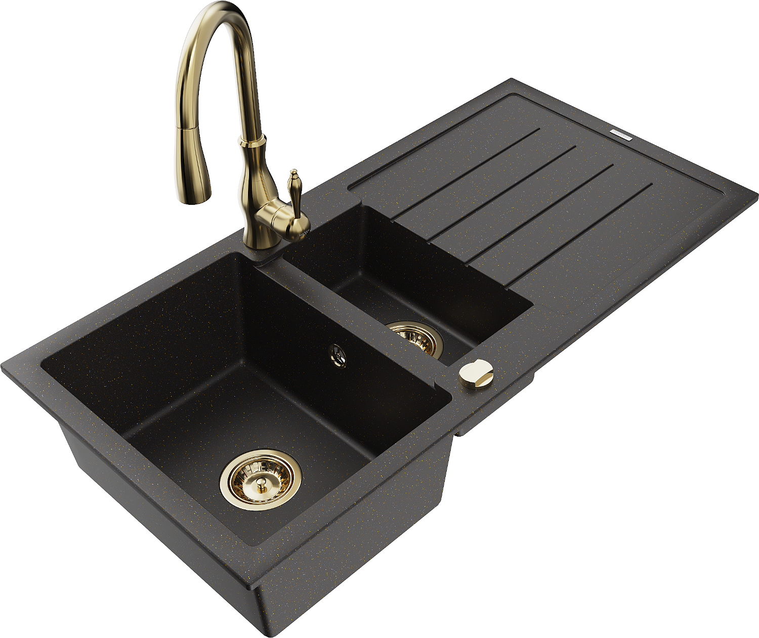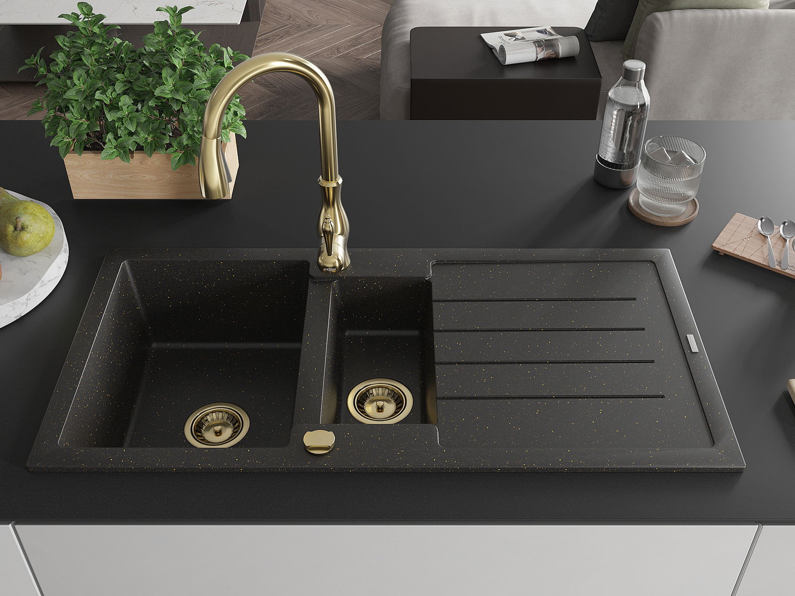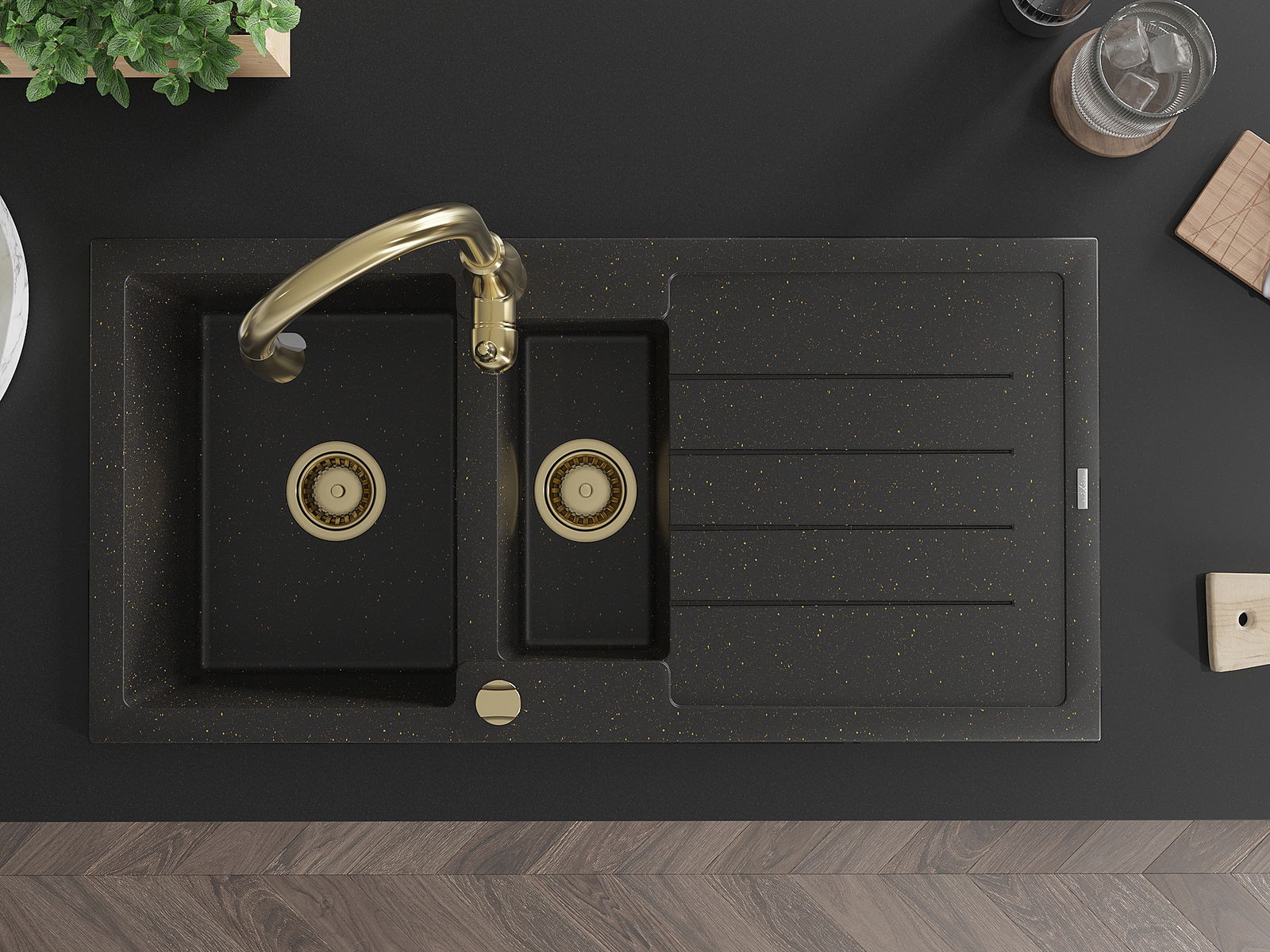Mexen Andres grindinis virtuvinis stalviršis 1,5 skyrių su nutekėjimu ir Savita virtuvės maišytuvu, juodas/auksinis