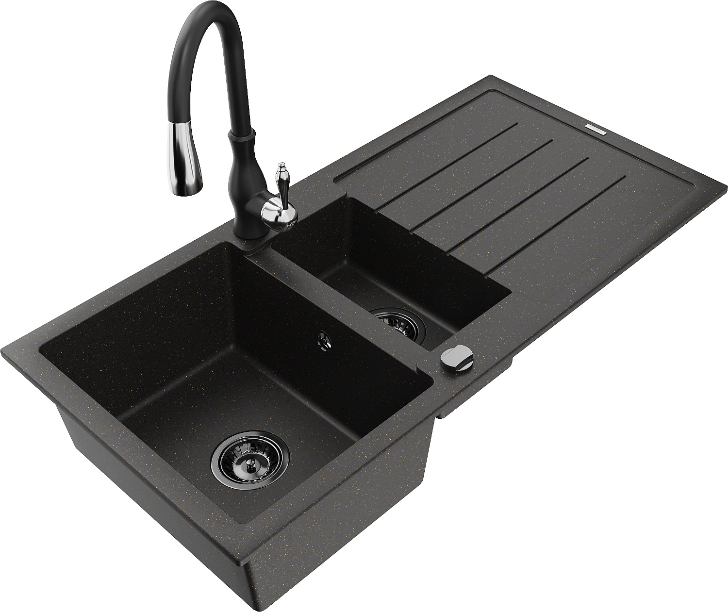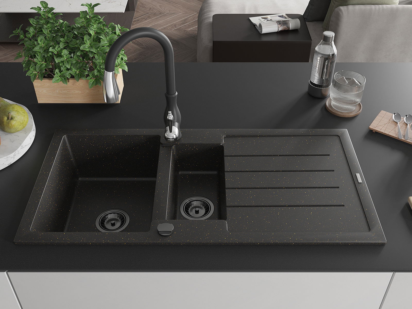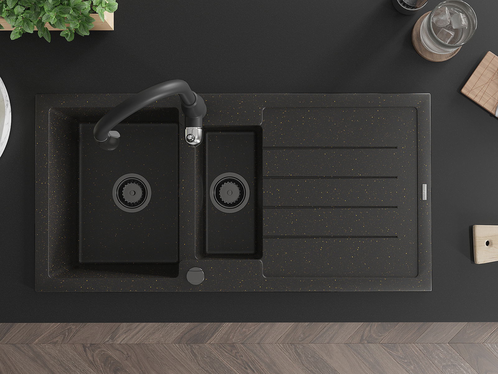 Mexen Andres granitinis 1,5 kameros plautuvės su nutekėjimu ir virtuvės maišytuvu Savita, juodas/auksinis - 6515-75-672601-70-B