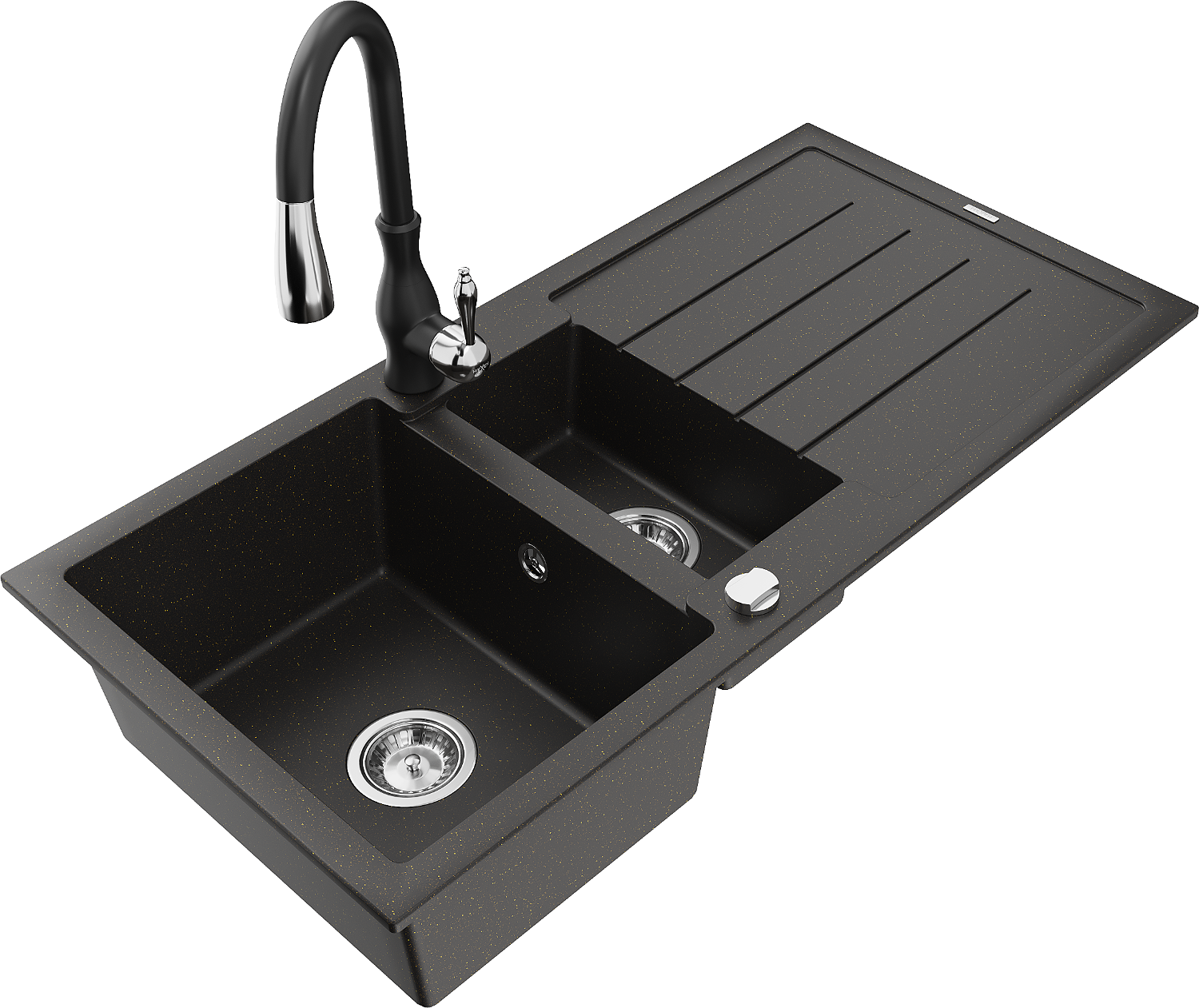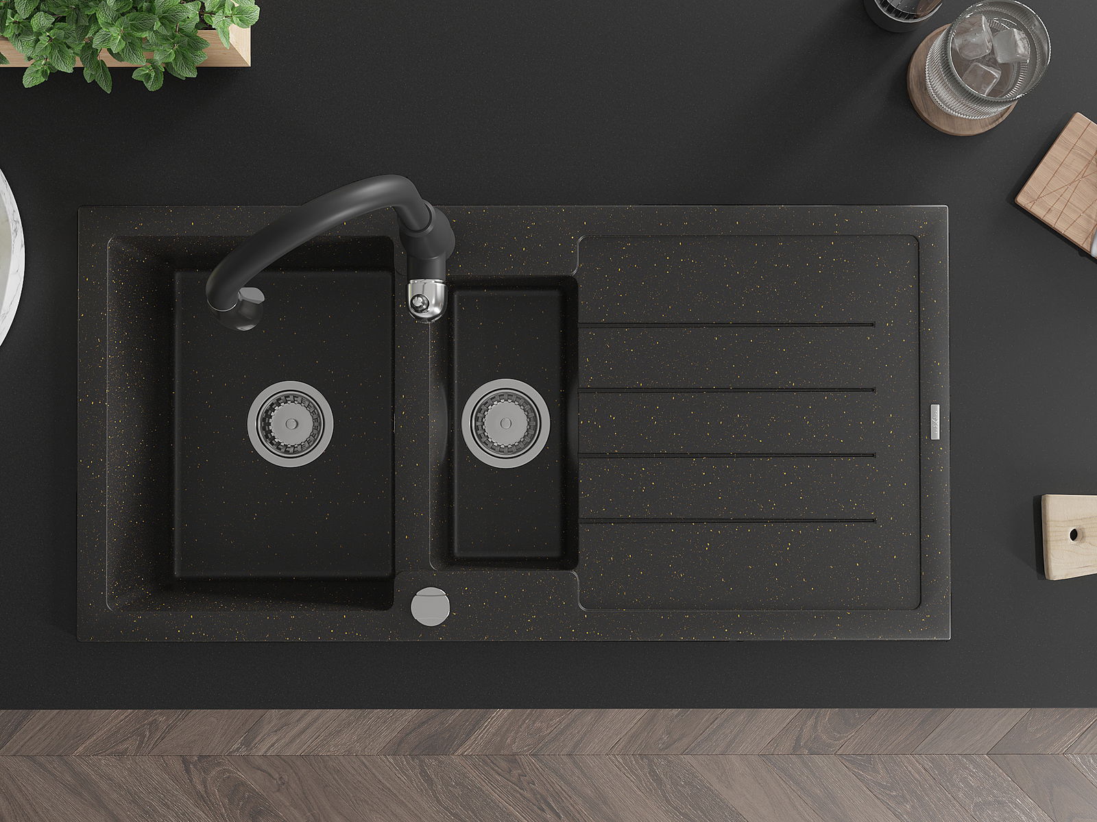 Mexen Andres 1,5 skylių granito plautuvė su nusausintuvu ir virtuviniu maišytuvu Savita, juoda/auksinė metalikas