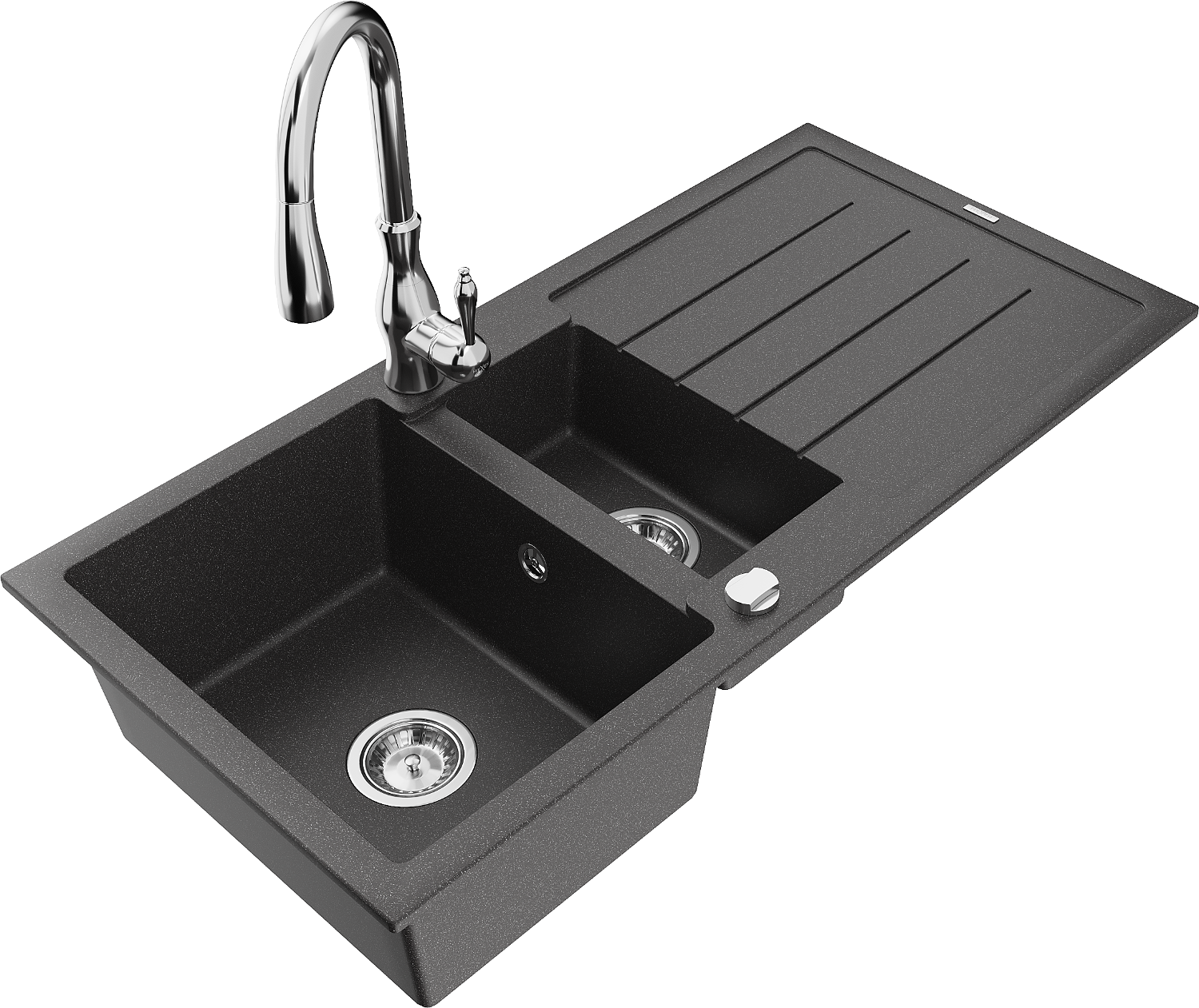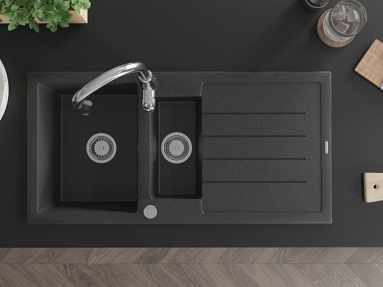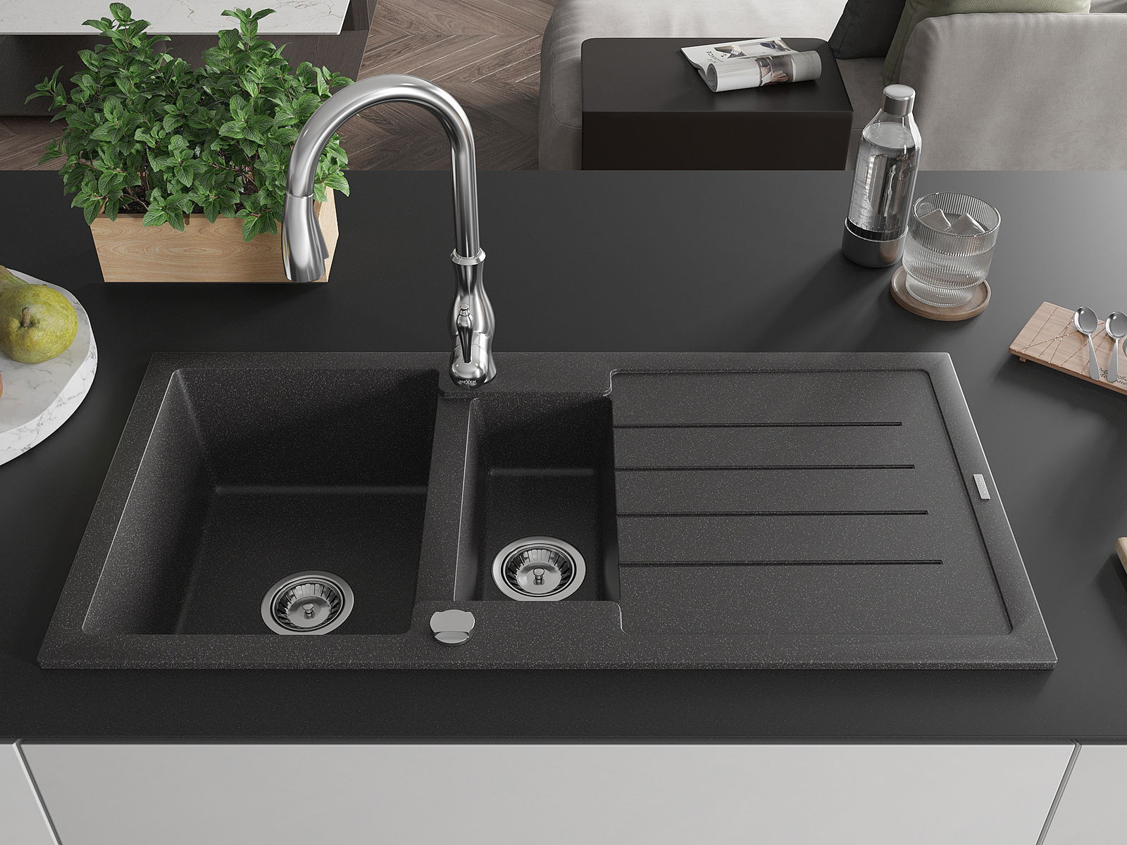 Mexen Andres granitinė 1,5 kamerų plautuvė su nusausintuvu ir virtuviniu maišytuvu Savita, juoda dėmėta