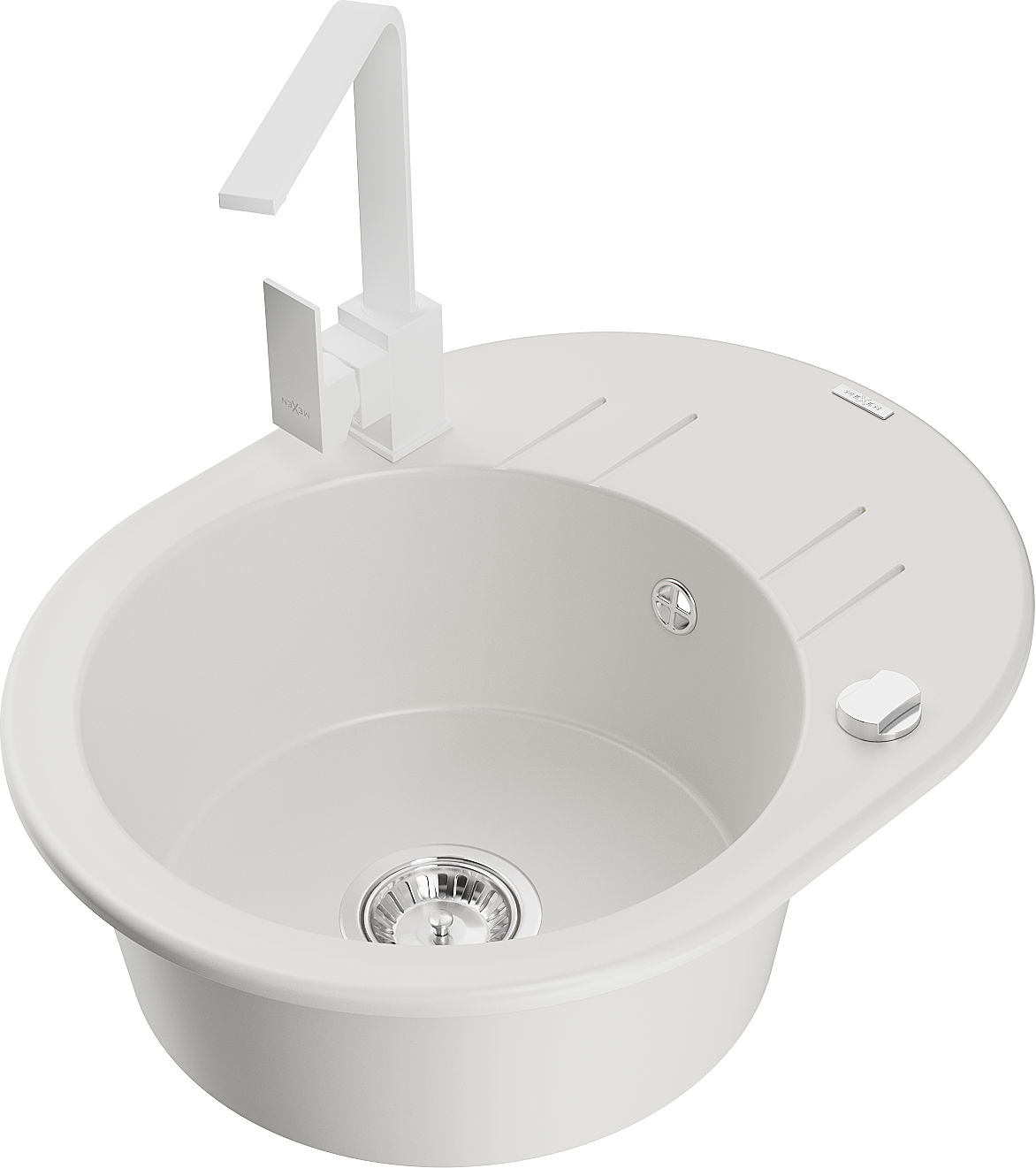 Mexen Kevin vienos kameros granitinė kriauklė su nusausintuvu ir virtuvės maišytuvu Rita, balta - 6517-20-670300-20