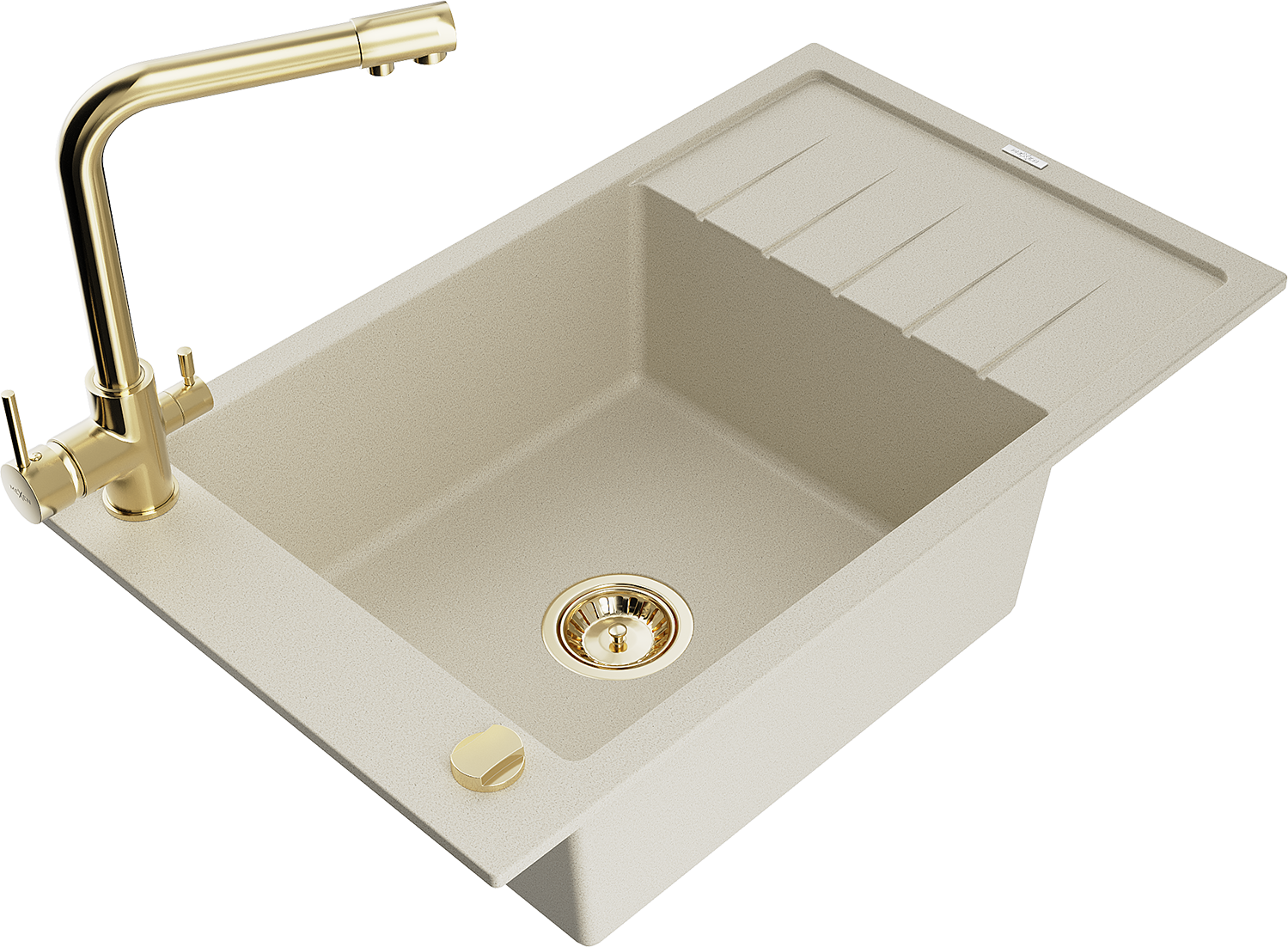 Mexen Elias granitinė vienos kameros plautuvė su lašintuvu ir virtuviniu maišytuvu Duero, smėlio spalvos