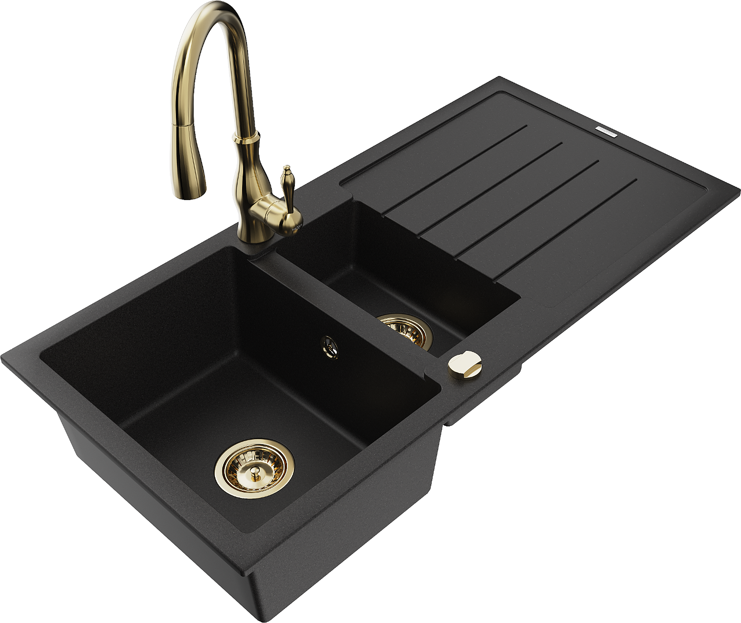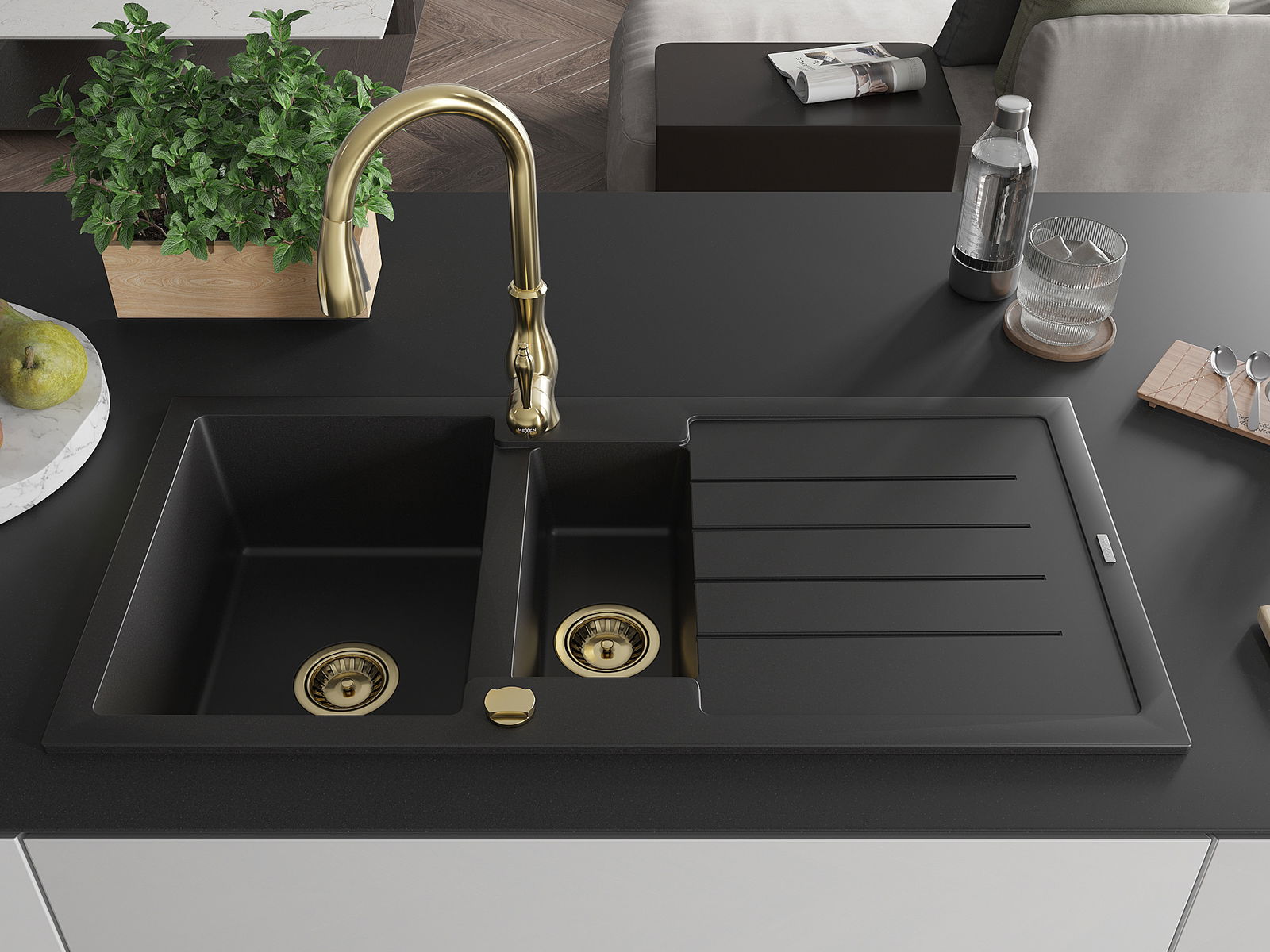 Mexen Andres granitinis kriauklė 1,5 kamerų su nusausintuvu ir virtuvės maišytuvu Savita, juoda - 6515-77-672601-50