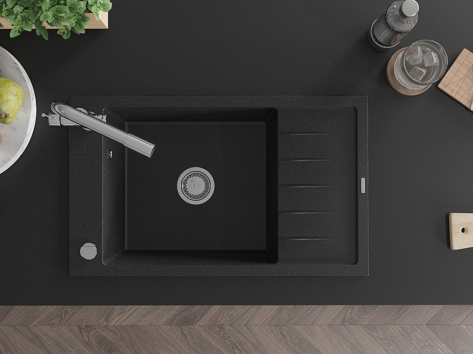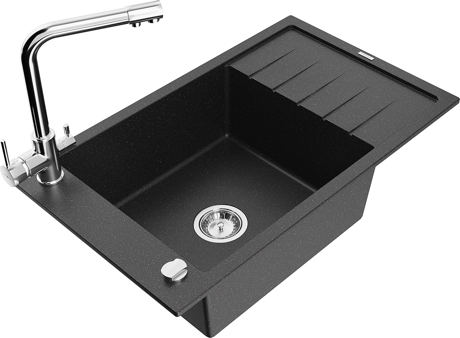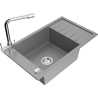 Mexen Elias granitinė vienaaukštė plautuvė su nutekamuoju ir virtuviniu maišytuvu Duero, juoda/sidabrinė metalika