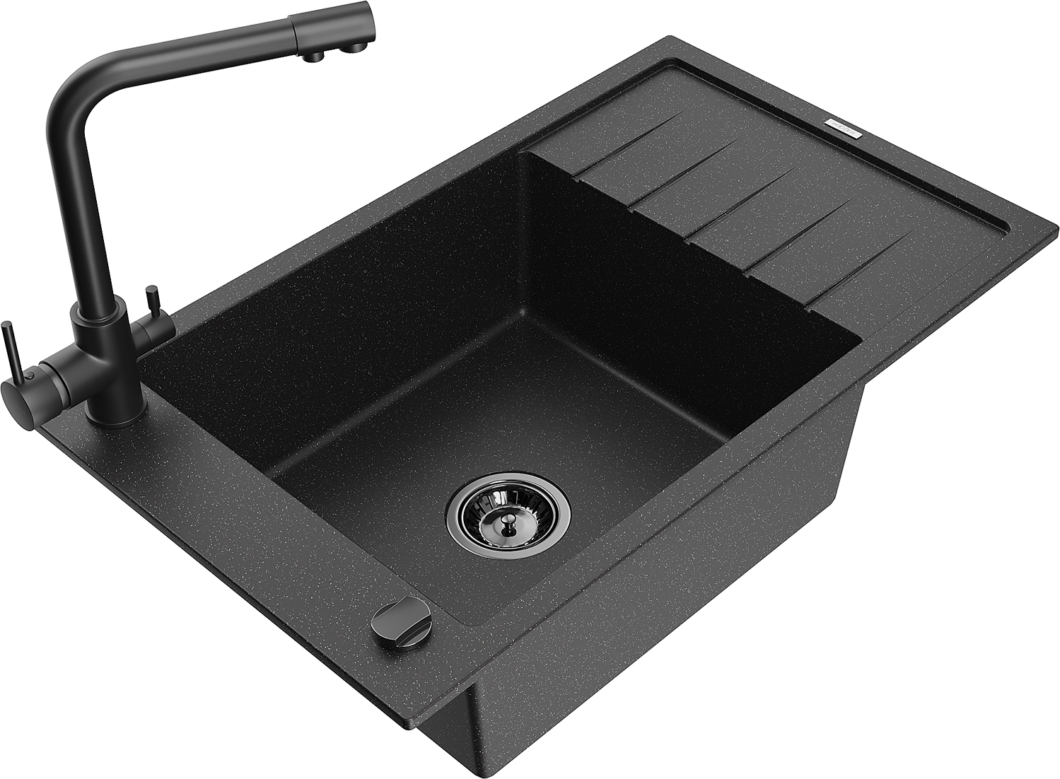 Mexen Elias vienos plautuvės granito plautuvė su nutekamu ir virtuviniu maišytuvu Duero, juodos/sidabrinės metalinės