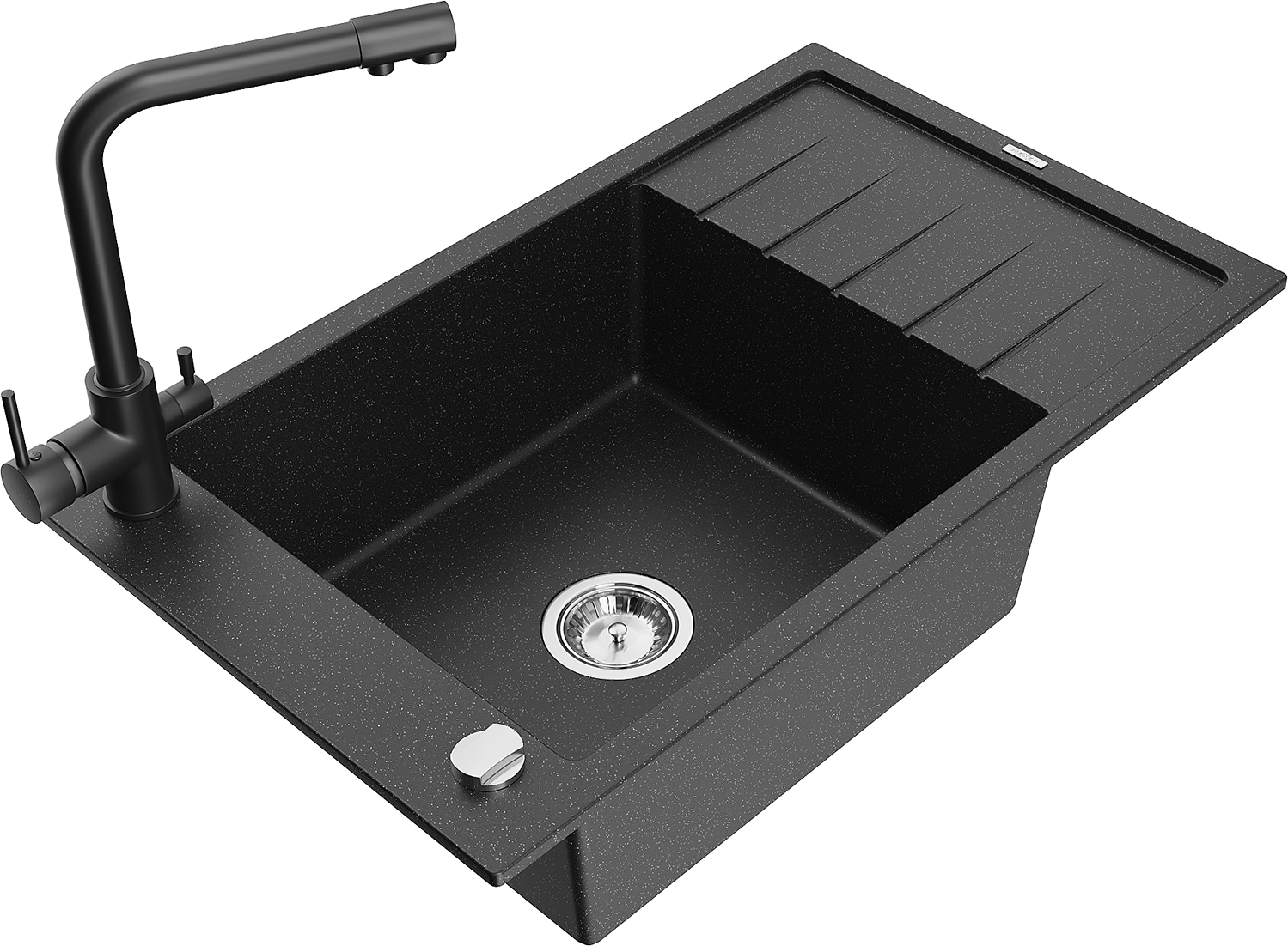 Mexen Elias granitinė vienaaukštė plautuvė su išdžiovintuvu ir virtuviniu maišytuvu Duero, juoda/sidabrinė metalika