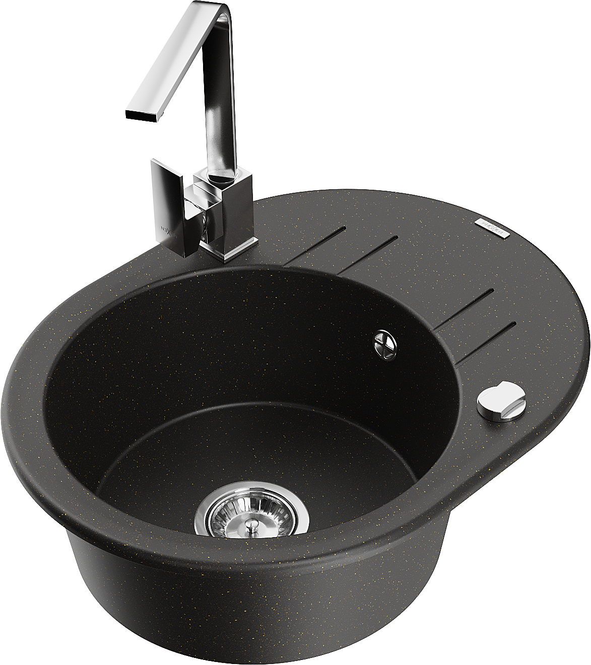 Mexen Kevin granitinė vienos kameros kriauklė su lašėjimo lentyna ir virtuvės maišytuvu Rita, juodas/auksinis metalikas