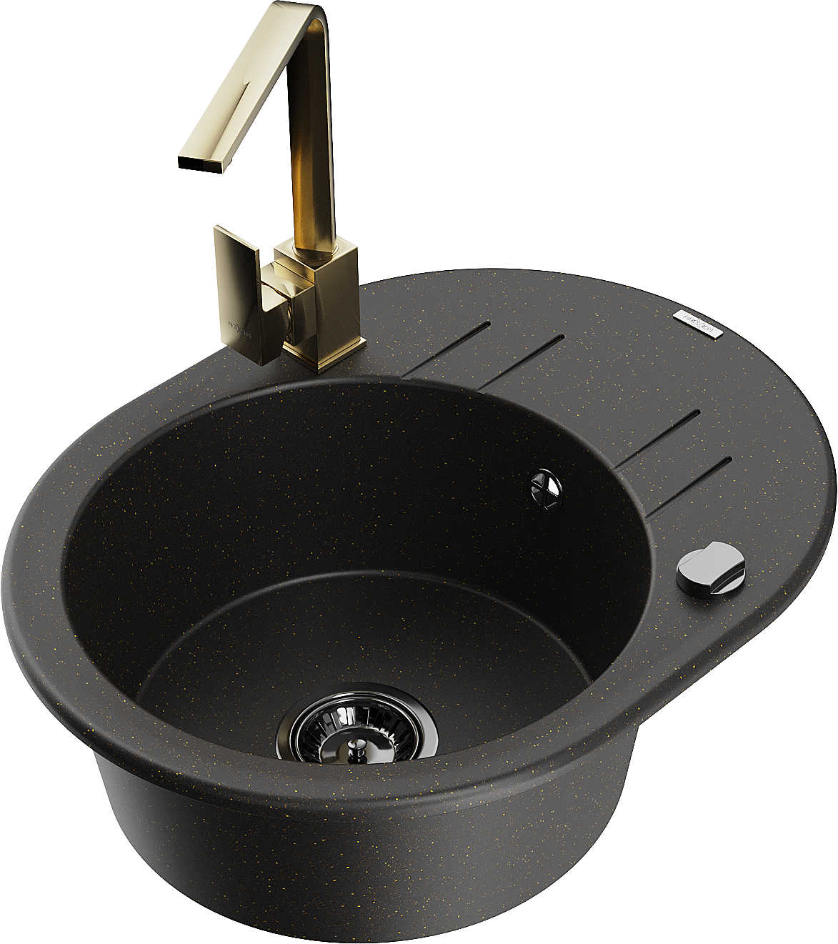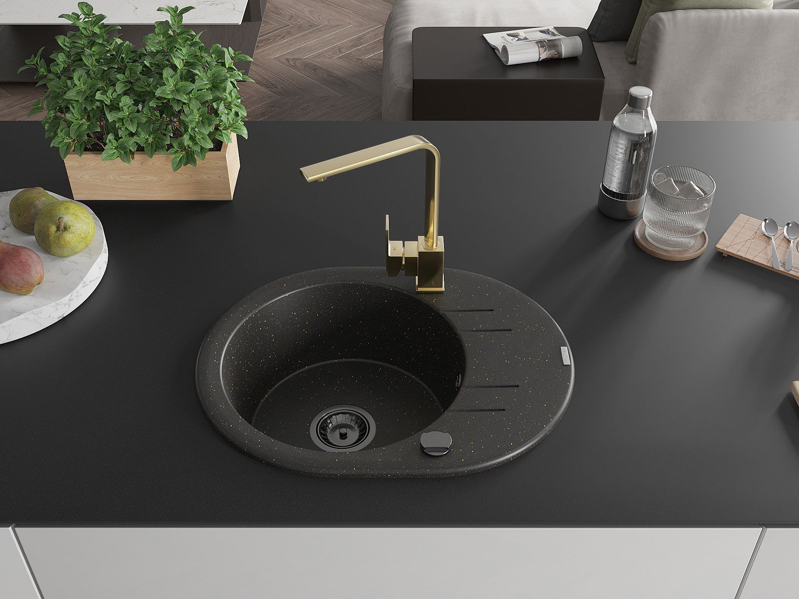 Mexen Kevin vienos sekcijos granitinis praustuvas su lašeliu ir virtuviniu maišytuvu Rita, juodas/auksinio metalo