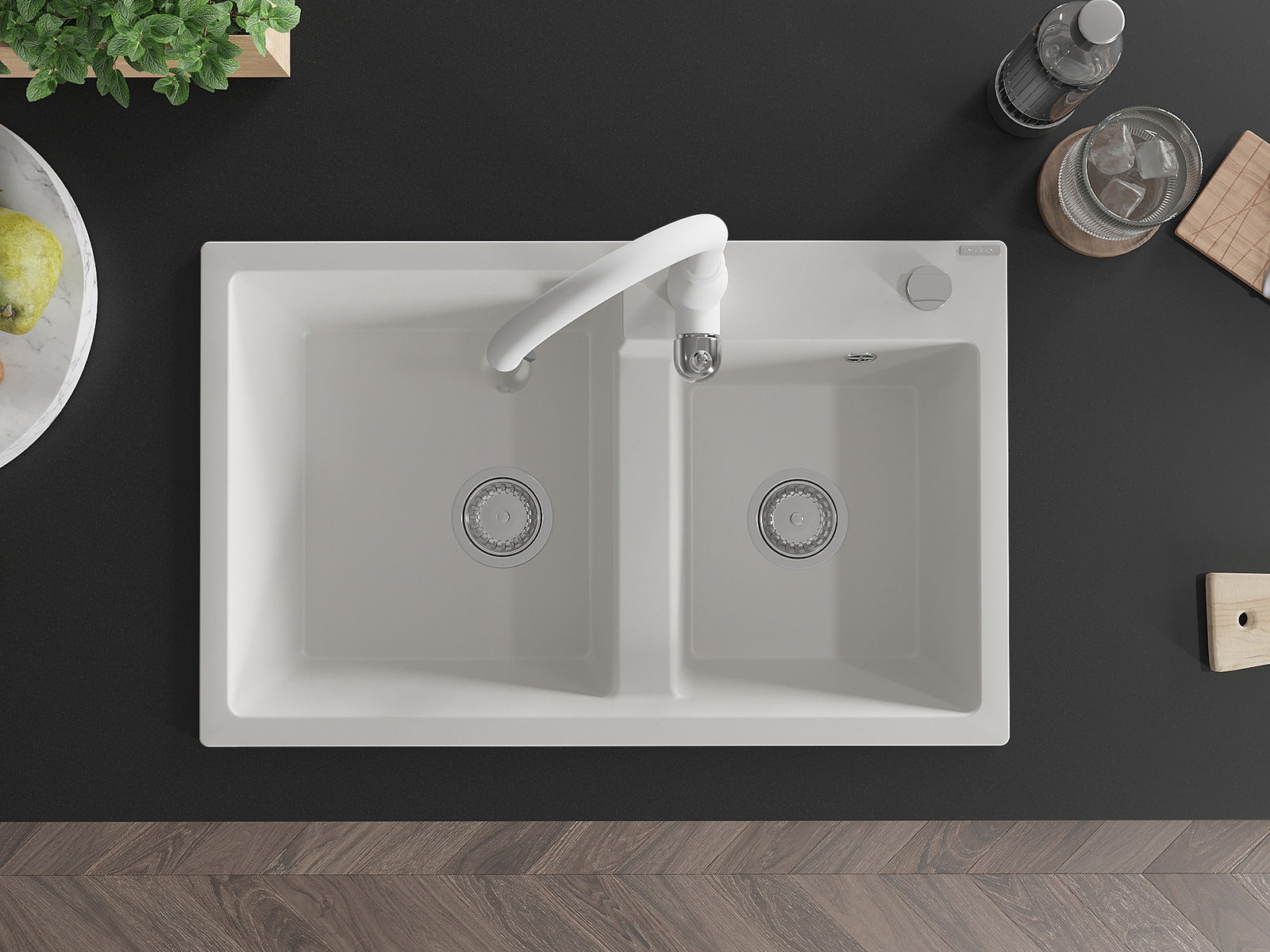 Mexen Tomas dviejų kamerų granito plautuvė su virtuvės maišytuvu Savita, balta - 6516-20-672601-20