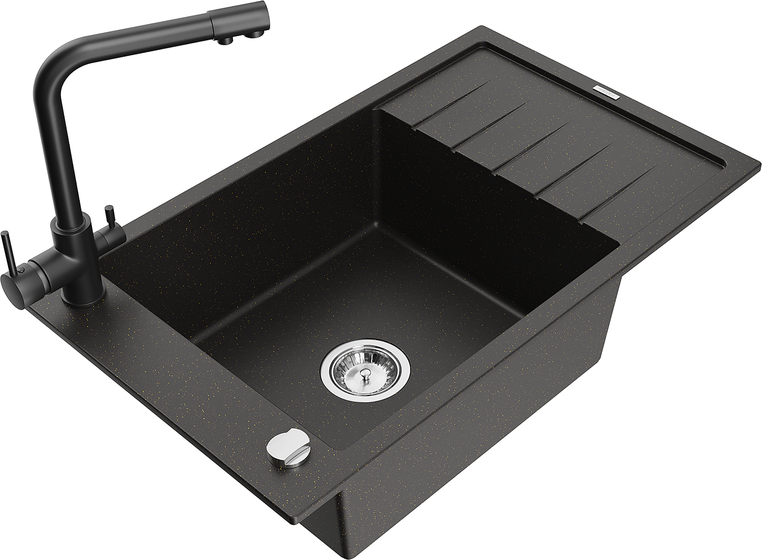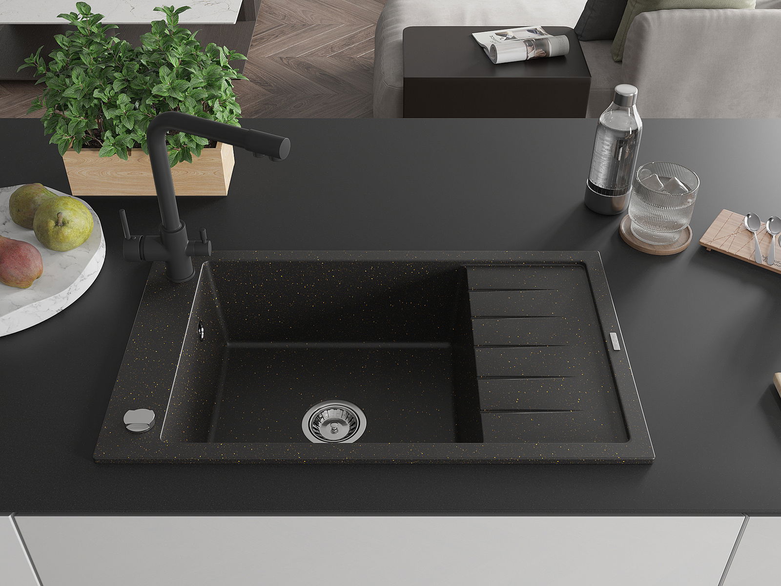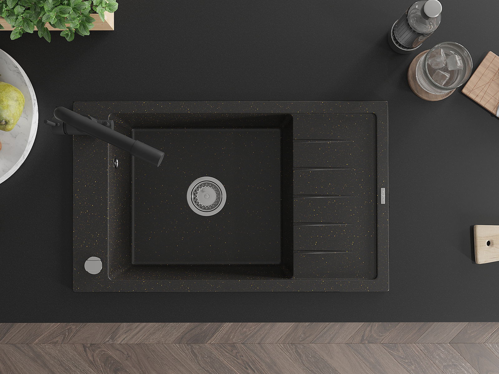 Mexen Elias granitinė virtuvės kriauklė su vienu dubeniu bei nusausinimo lentynėle ir Duero virtuviniu maišytuvu,