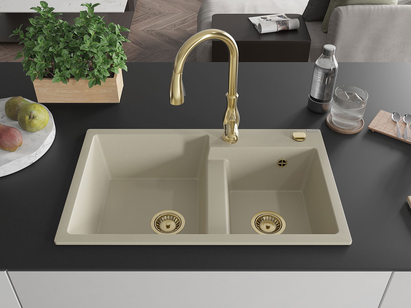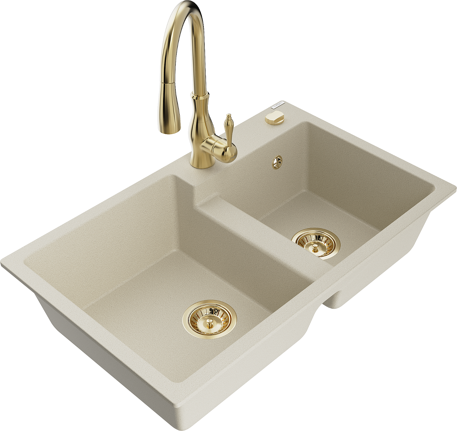 Mexen Tomas granitinė 2 kamerų virtuvinė plautuvė su virtuviniu maišytuvu Savita, smėlio spalvos - 6516-69-672601-50