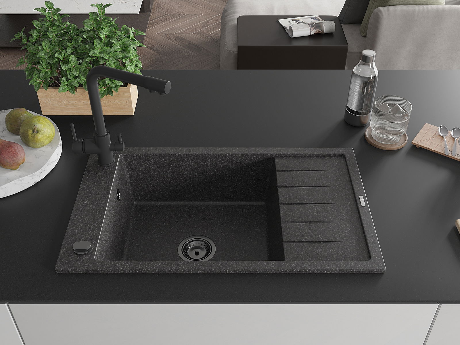 Mexen Elias granitinė vieno dubens kriauklė su nutekėjimu ir Duero virtuviniu maišytuvu, juoda dėmėta - 6511-76-671600-70-B